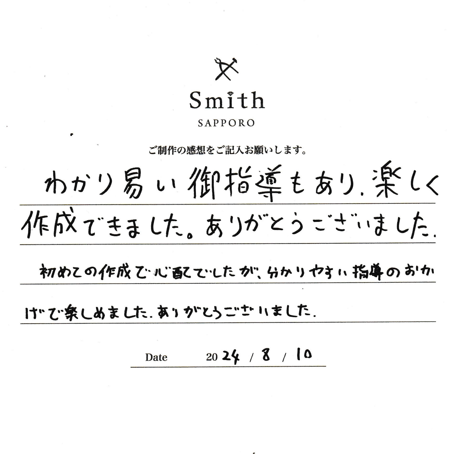 この度は、工房Smith京王プラザホテル札幌店で手作りペアリングのご制作誠にありがとうございました。
