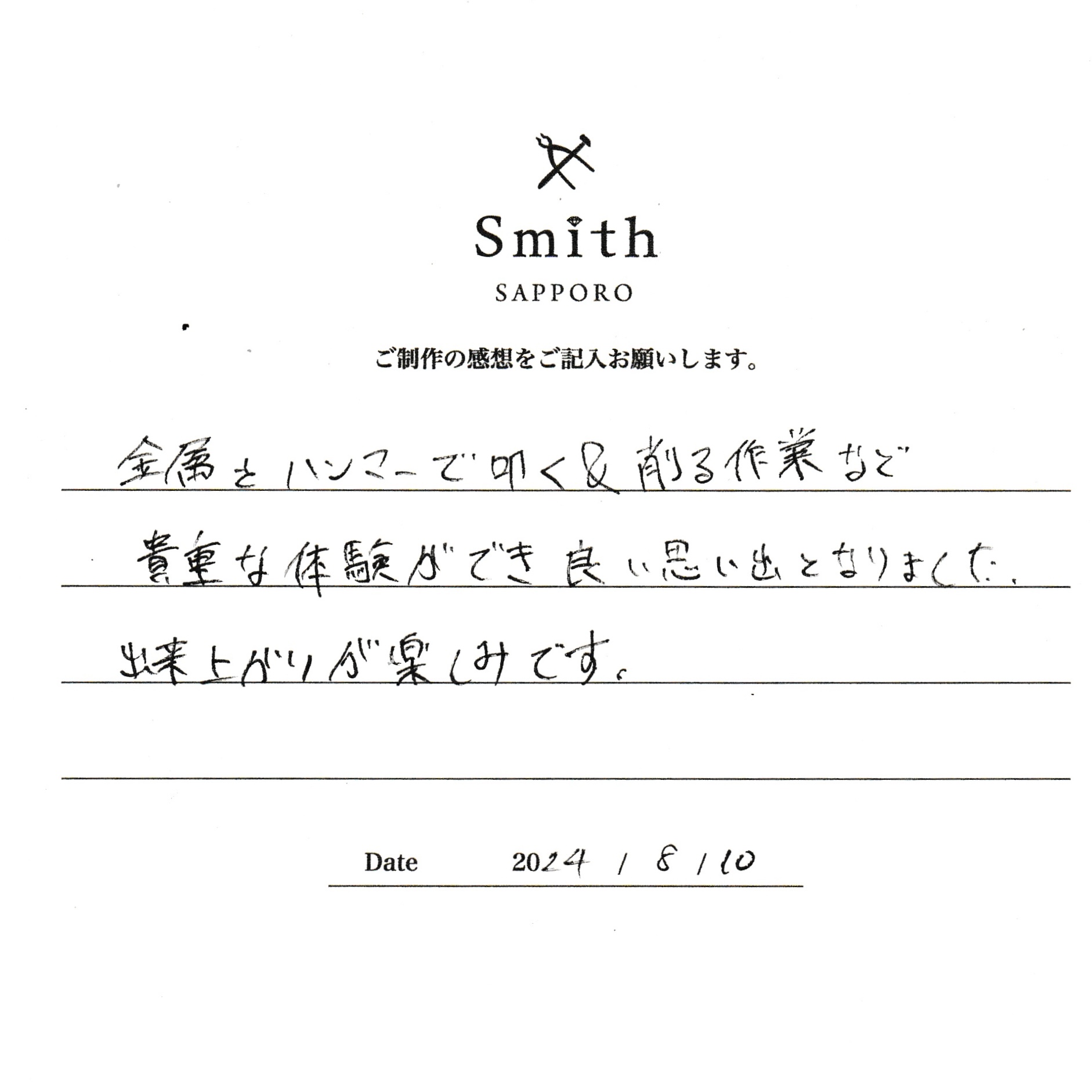 金属をハンマーで叩く& 削る作業など貴重な体験ができ良い思い出となりました。