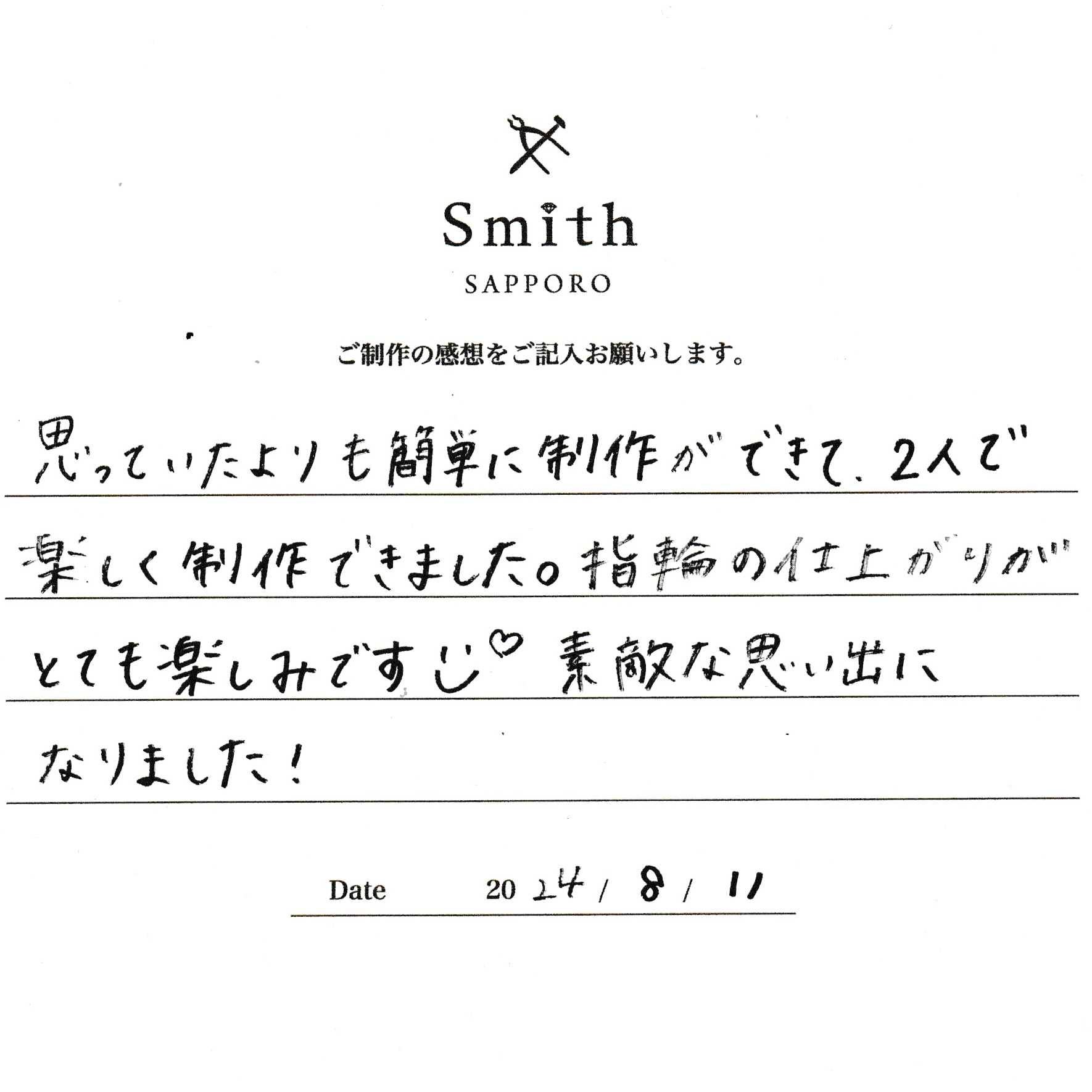 この度は、工房Smith京王プラザホテル札幌店で手作りペアリングのご制作誠にありがとうございました。