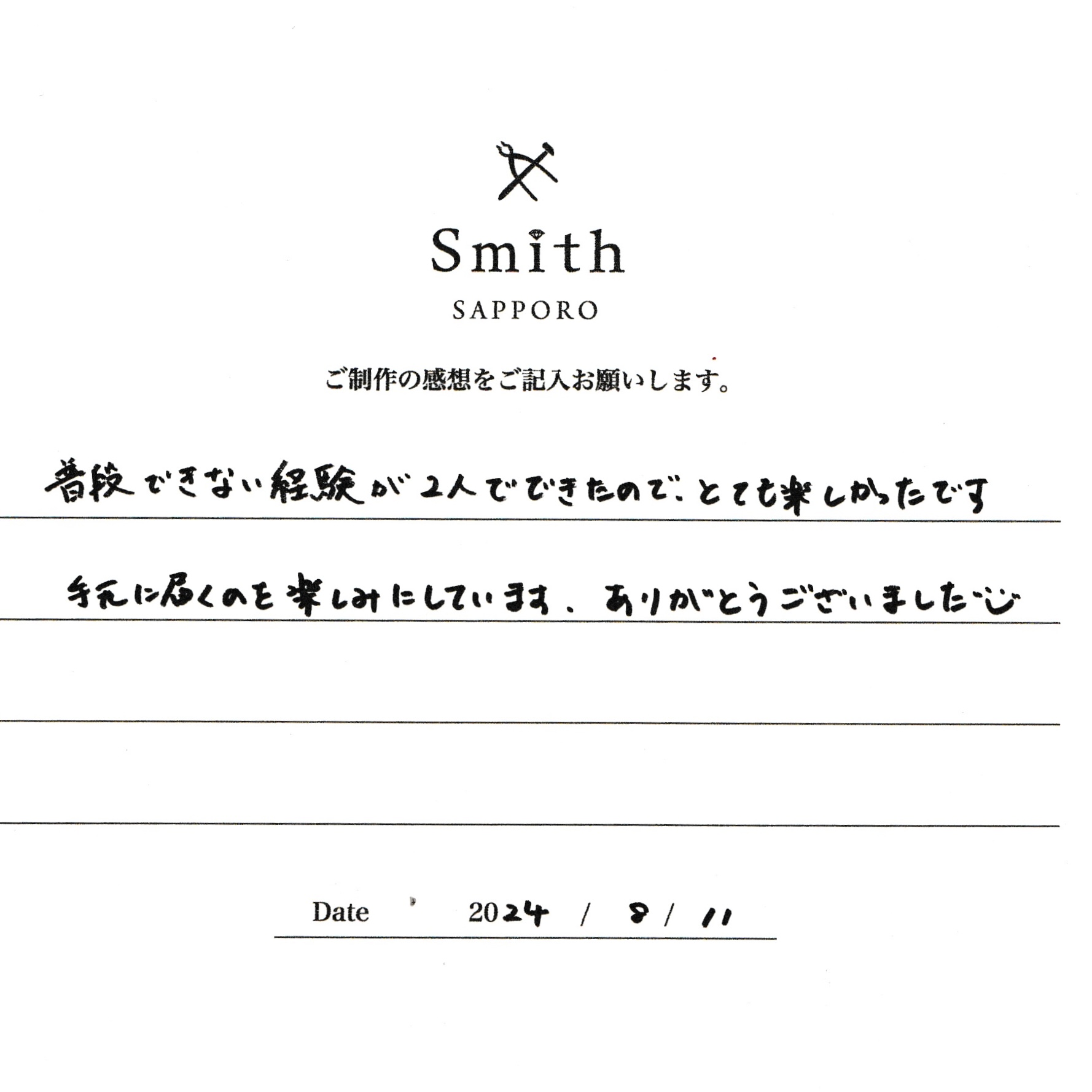 この度は、工房Smith京王プラザホテル札幌店で手作りペアリングのご制作誠にありがとうございました。