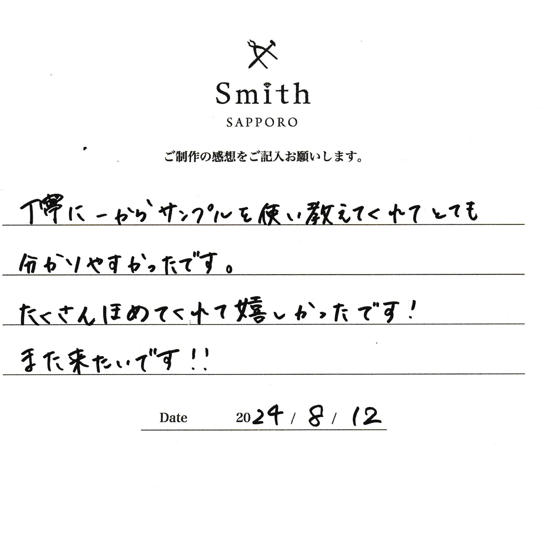 この度は、工房Smith京王プラザホテル札幌店で手作りペアリングのご制作誠にありがとうございました。