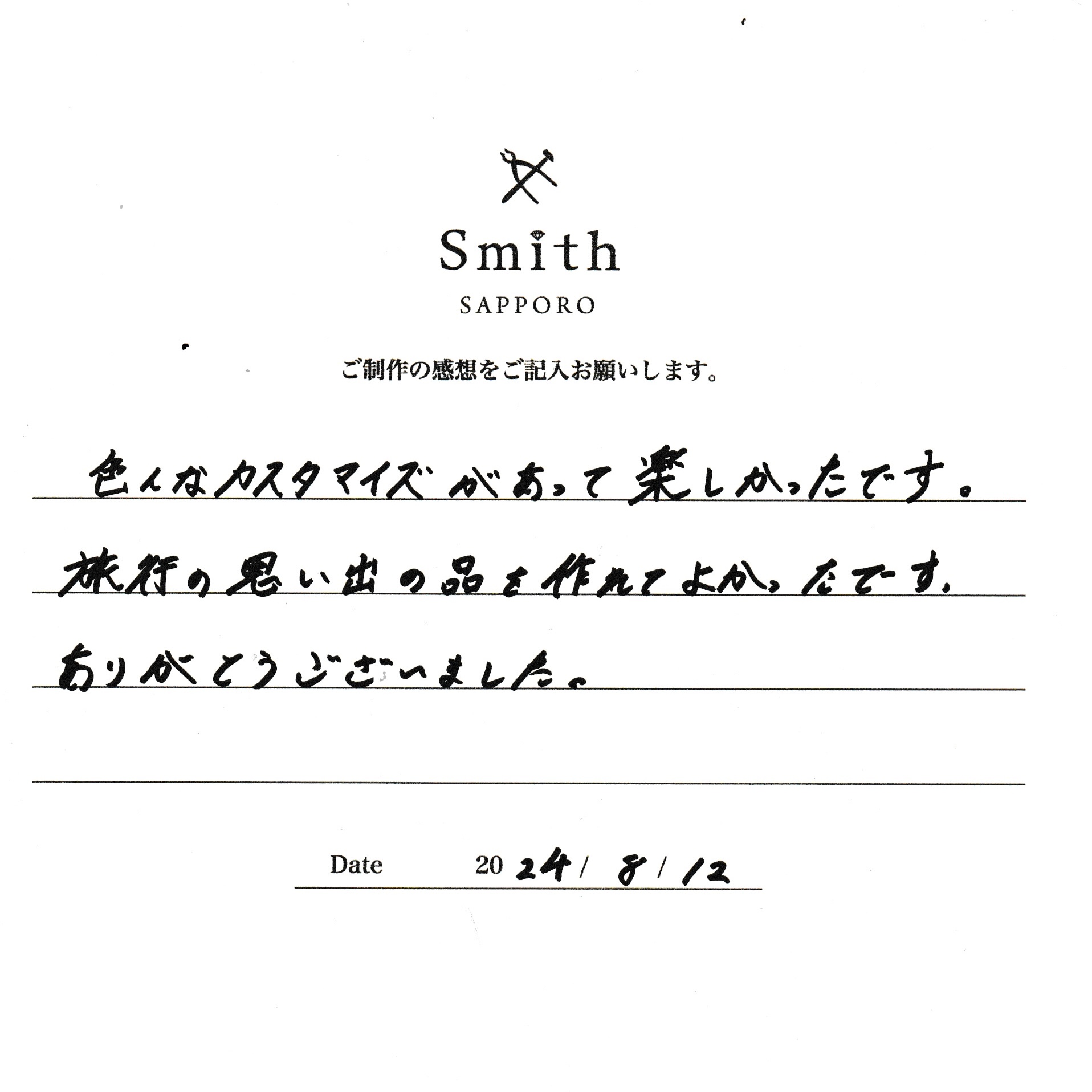 この度は、工房Smith京王プラザホテル札幌店で手作りペアリングのご制作誠にありがとうございました。