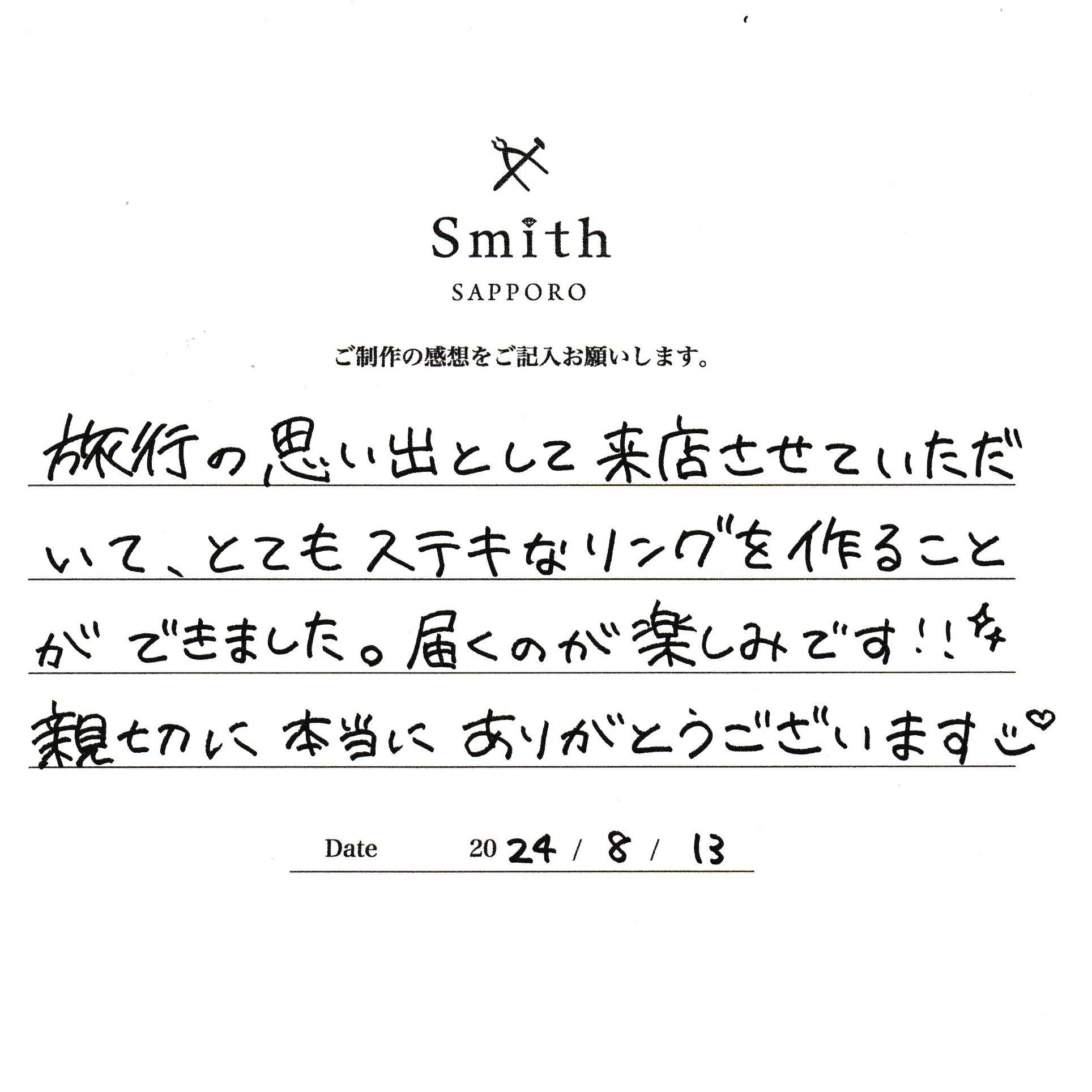 この度は、工房Smith京王プラザホテル札幌店で手作りペアリングのご制作誠にありがとうございました。