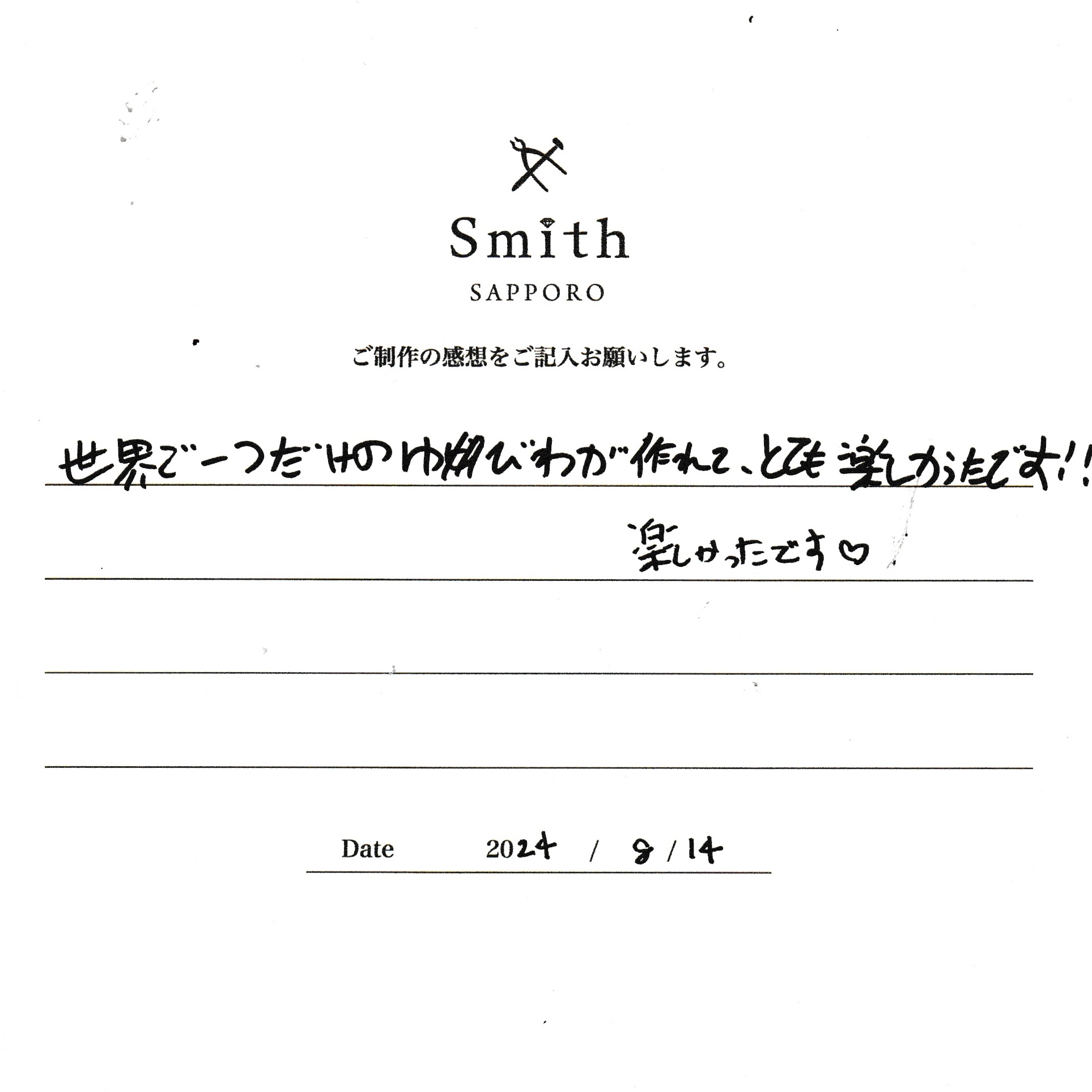 この度は、工房Smith京王プラザホテル札幌店で手作りペアリングのご制作誠にありがとうございました。