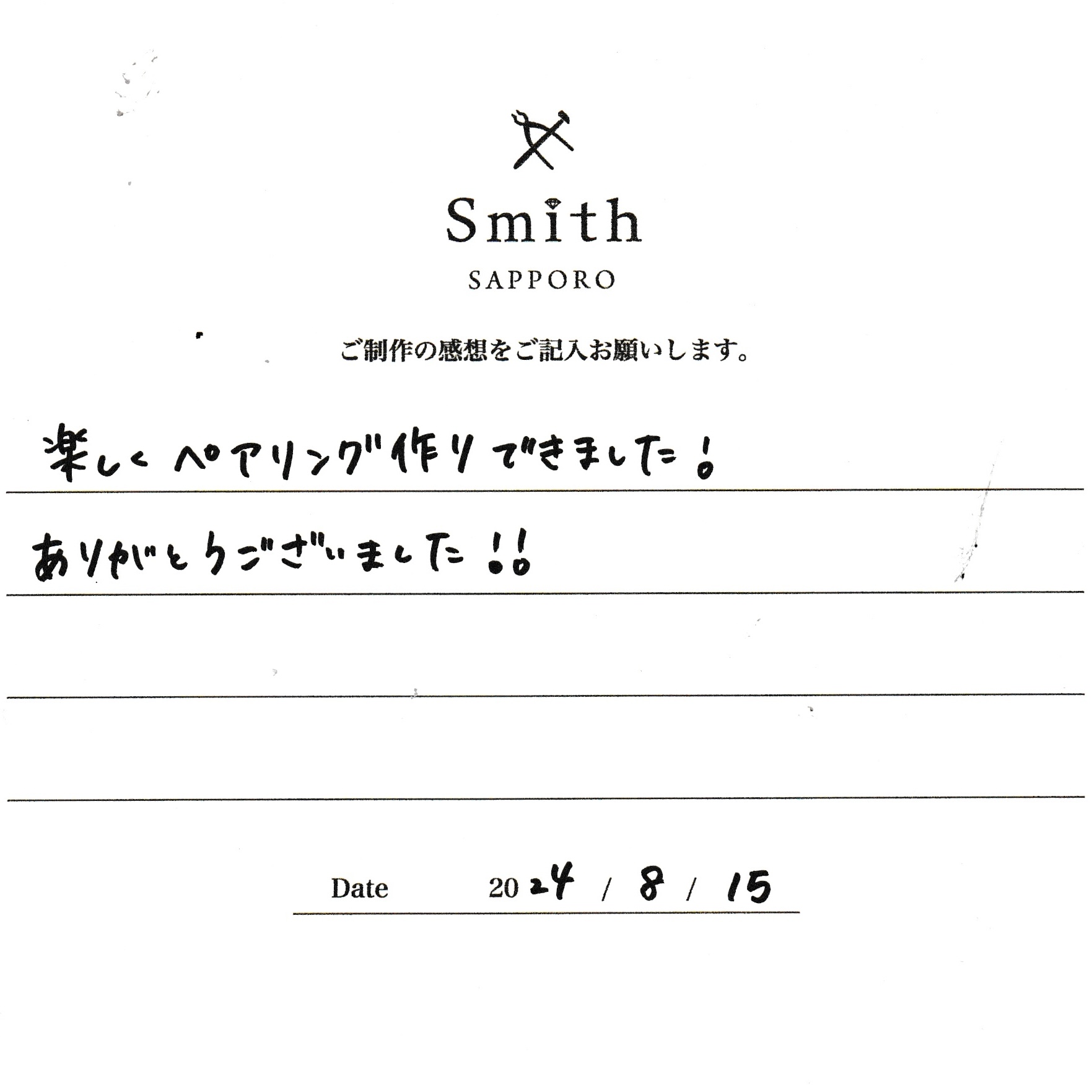 この度は、工房Smith京王プラザホテル札幌店で手作りペアリングのご制作誠にありがとうございました。