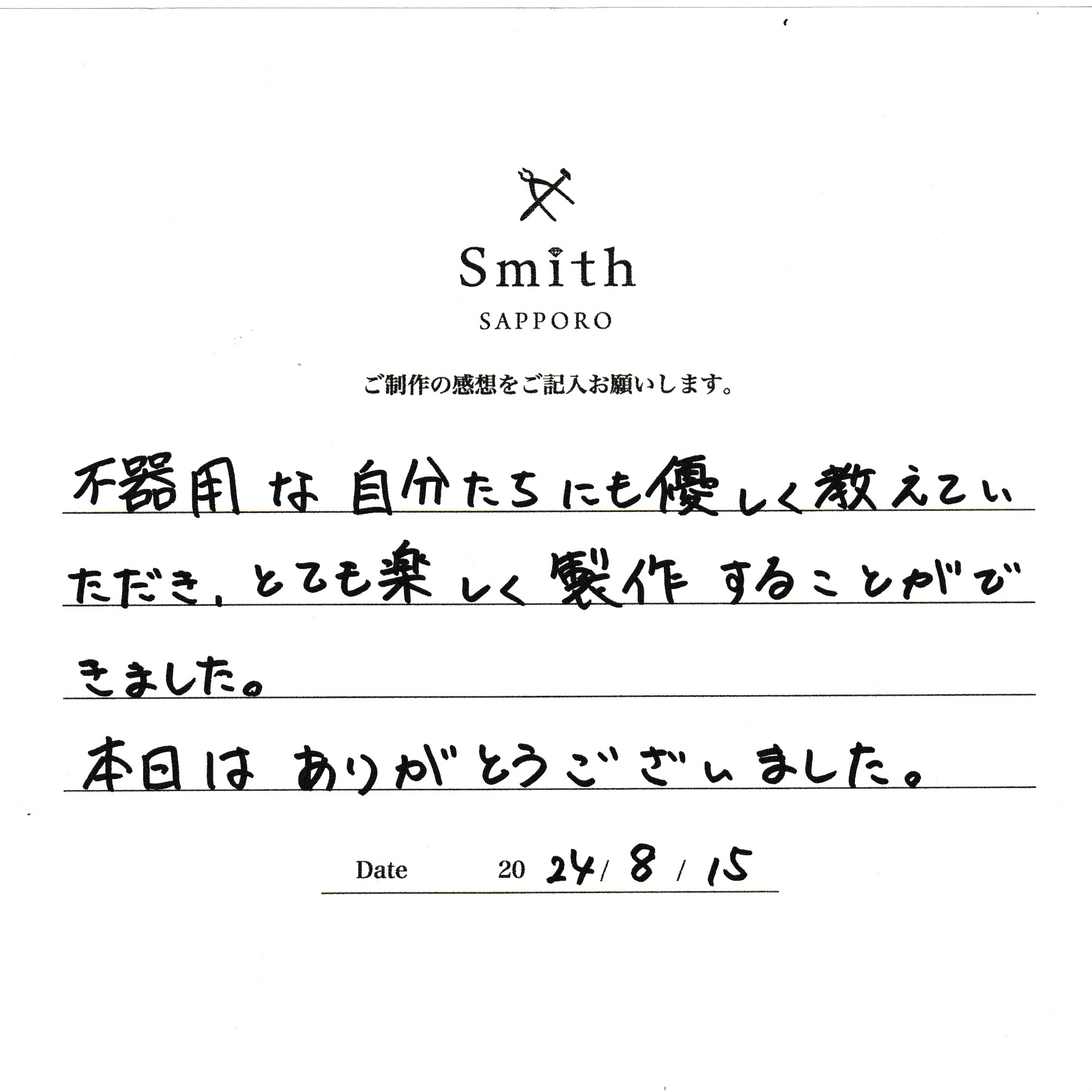 この度は、工房Smith京王プラザホテル札幌店で手作りペアリングのご制作誠にありがとうございました。