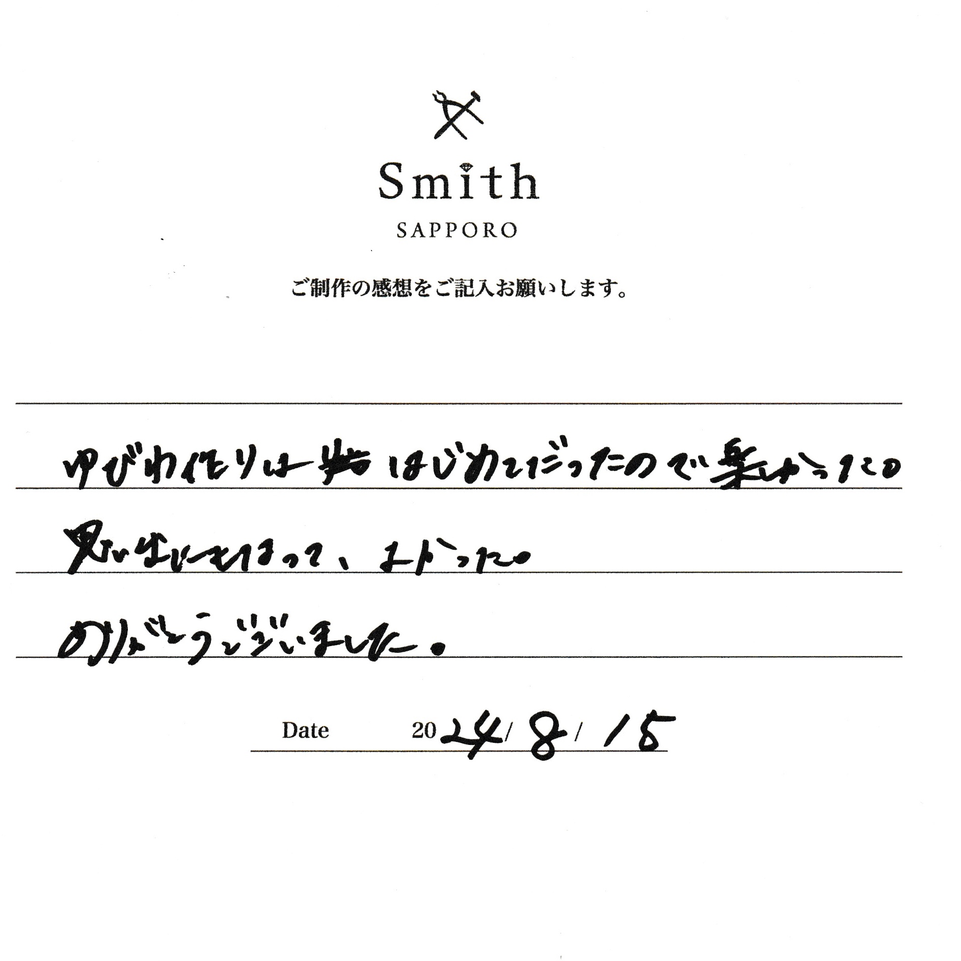 この度は、工房Smith京王プラザホテル札幌店で手作りペアリングのご制作誠にありがとうございました。