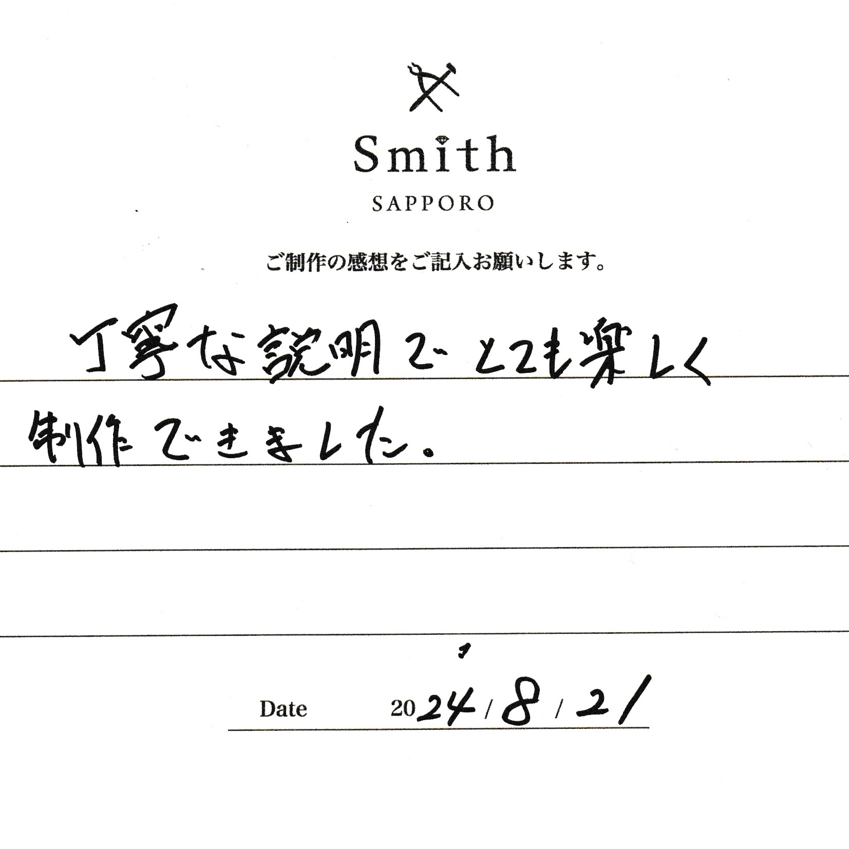この度は、工房Smith京王プラザホテル札幌店で手作りペアリングのご制作誠にありがとうございました。