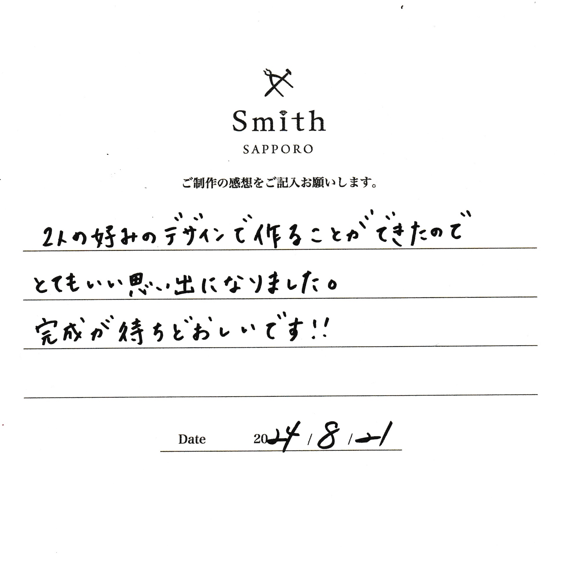 この度は、工房Smith京王プラザホテル札幌店で手作りペアリングのご制作誠にありがとうございました。