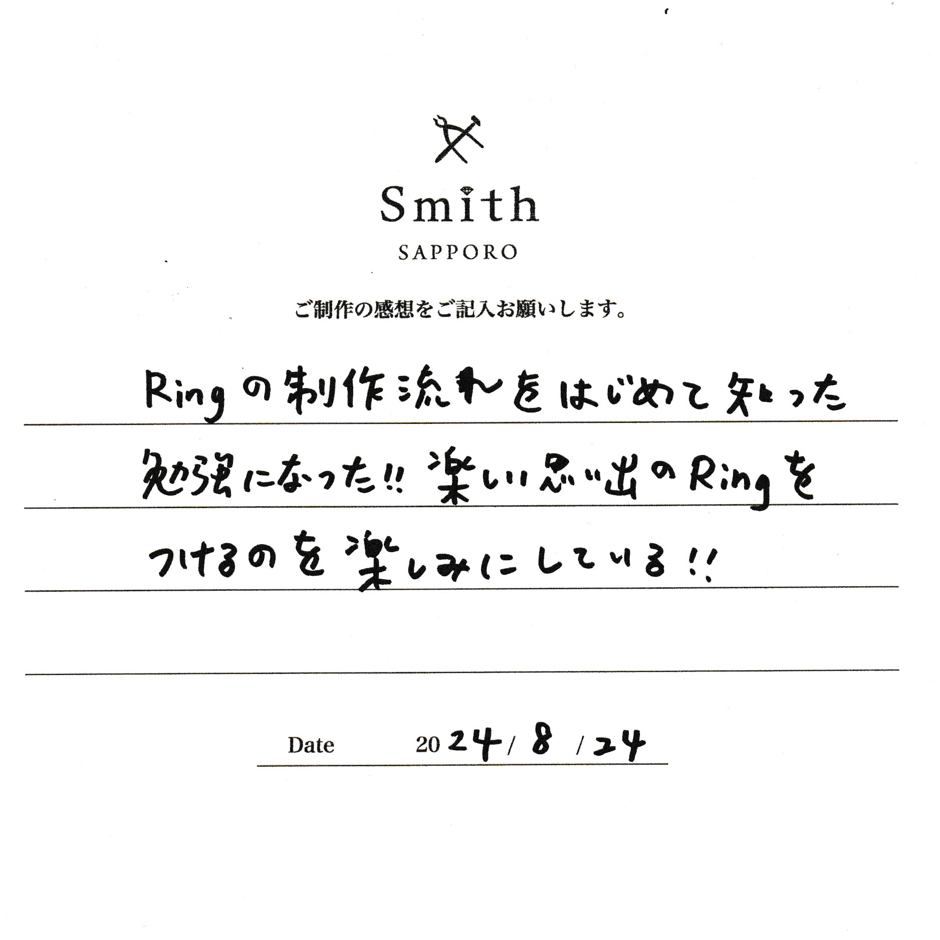 この度は、工房Smith京王プラザホテル札幌店で手作りペアリングのご制作誠にありがとうございました。