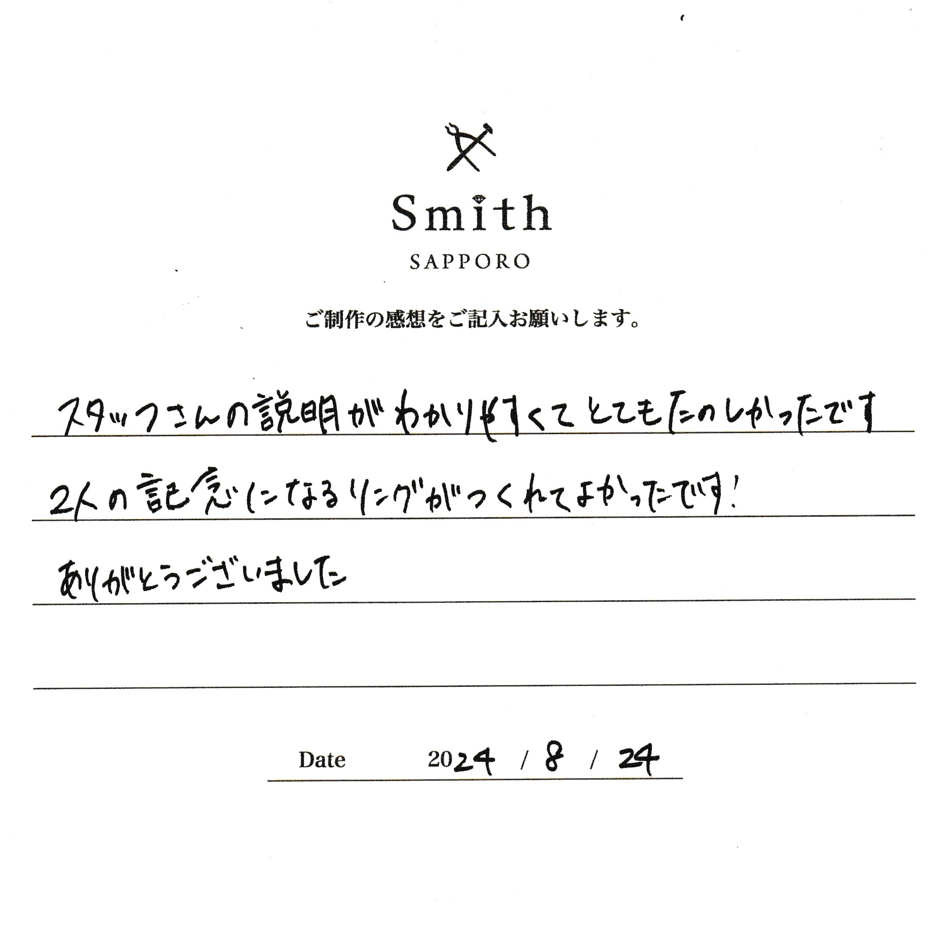 この度は、工房Smith京王プラザホテル札幌店で手作りペアリングのご制作誠にありがとうございました。