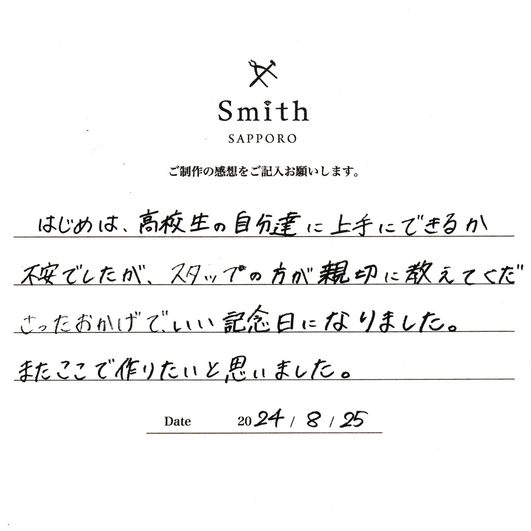 この度は、工房Smith京王プラザホテル札幌店で手作りペアリングのご制作誠にありがとうございました。