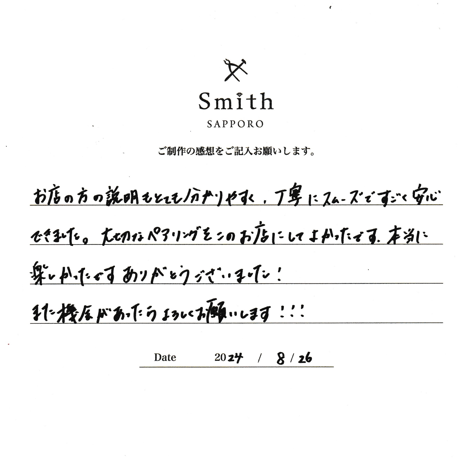 この度は、工房Smith京王プラザホテル札幌店で手作りペアリングのご制作誠にありがとうございました。