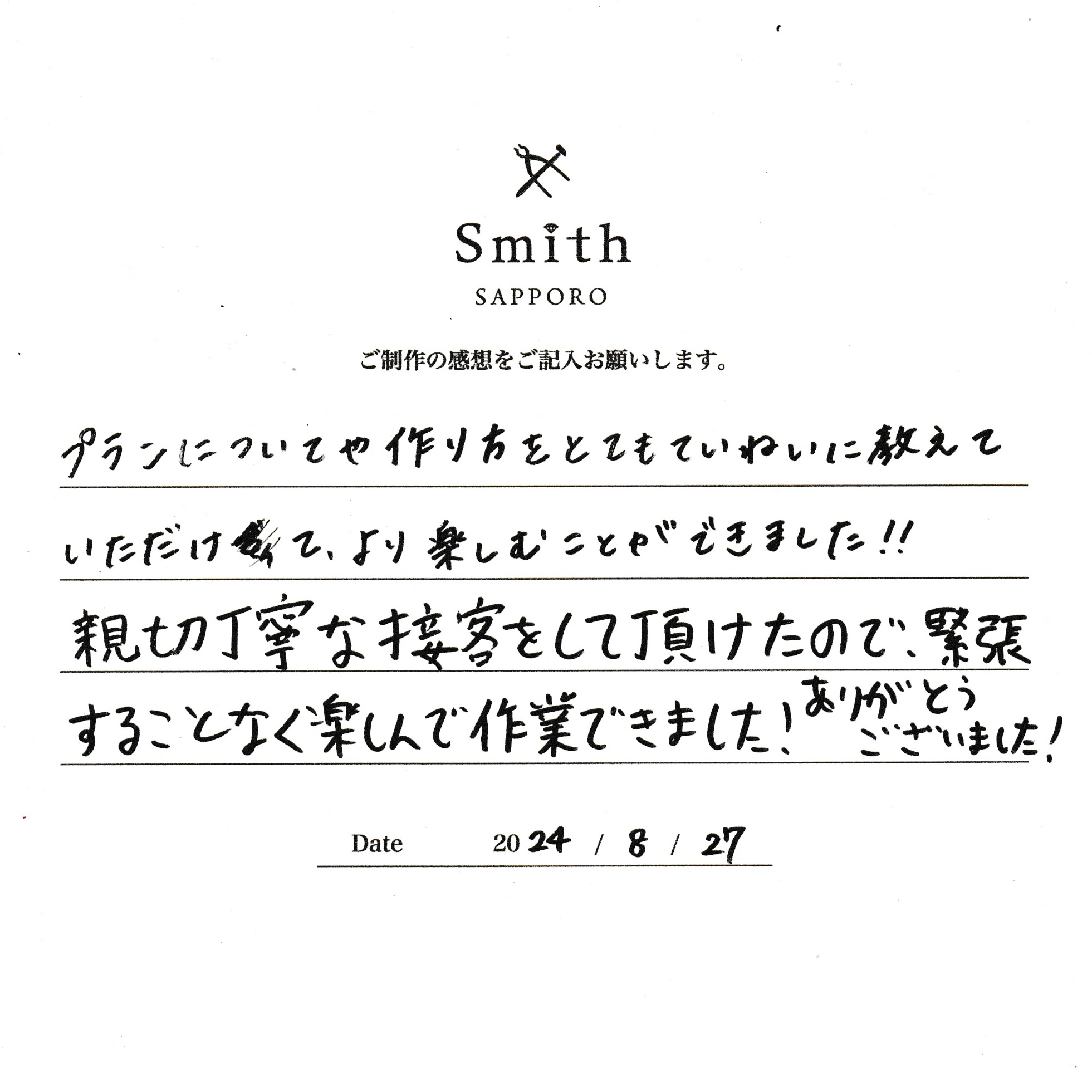 この度は、工房Smith京王プラザホテル札幌店で手作りペアリングのご制作誠にありがとうございました。