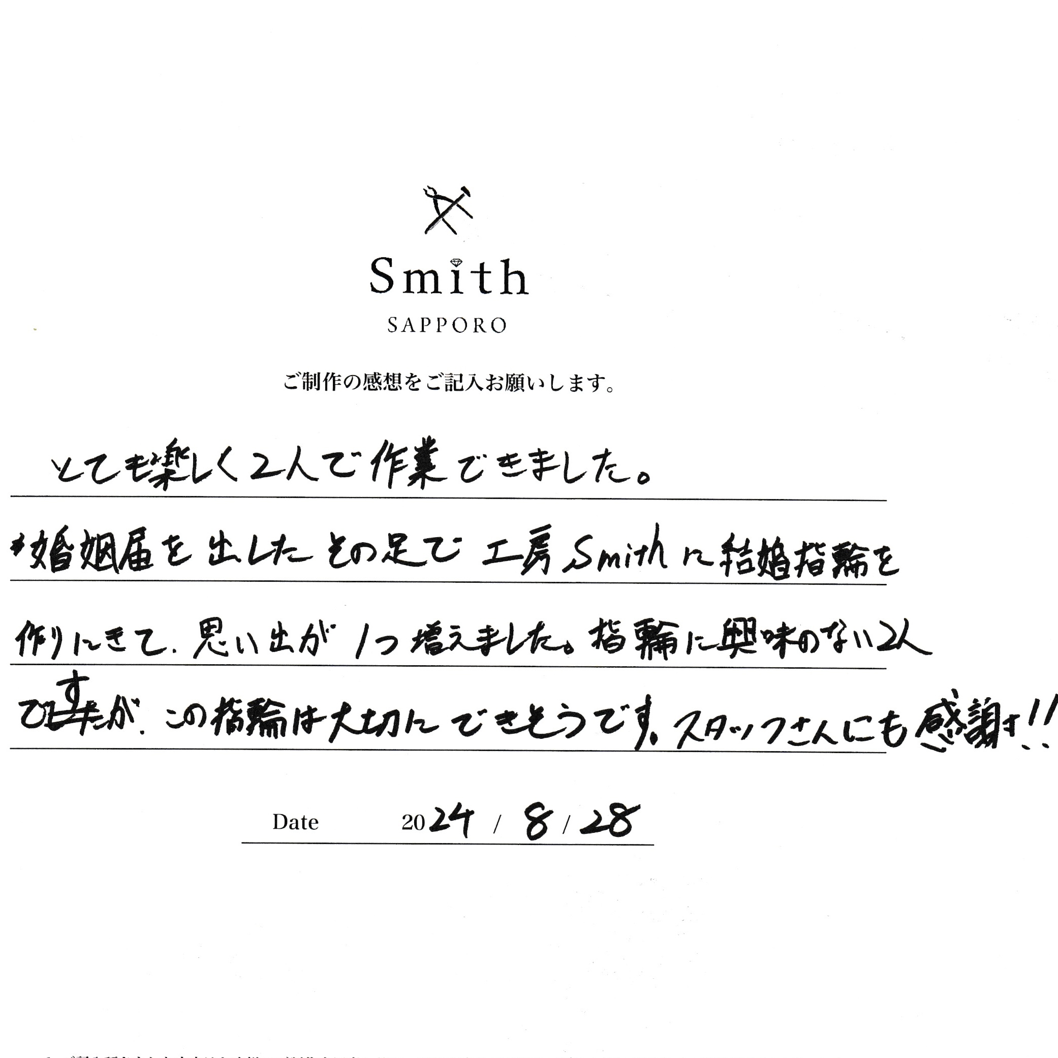 この度は手作り結婚指輪のご制作に工房スミス札幌本店をご利用いただき誠にありがとうございます。