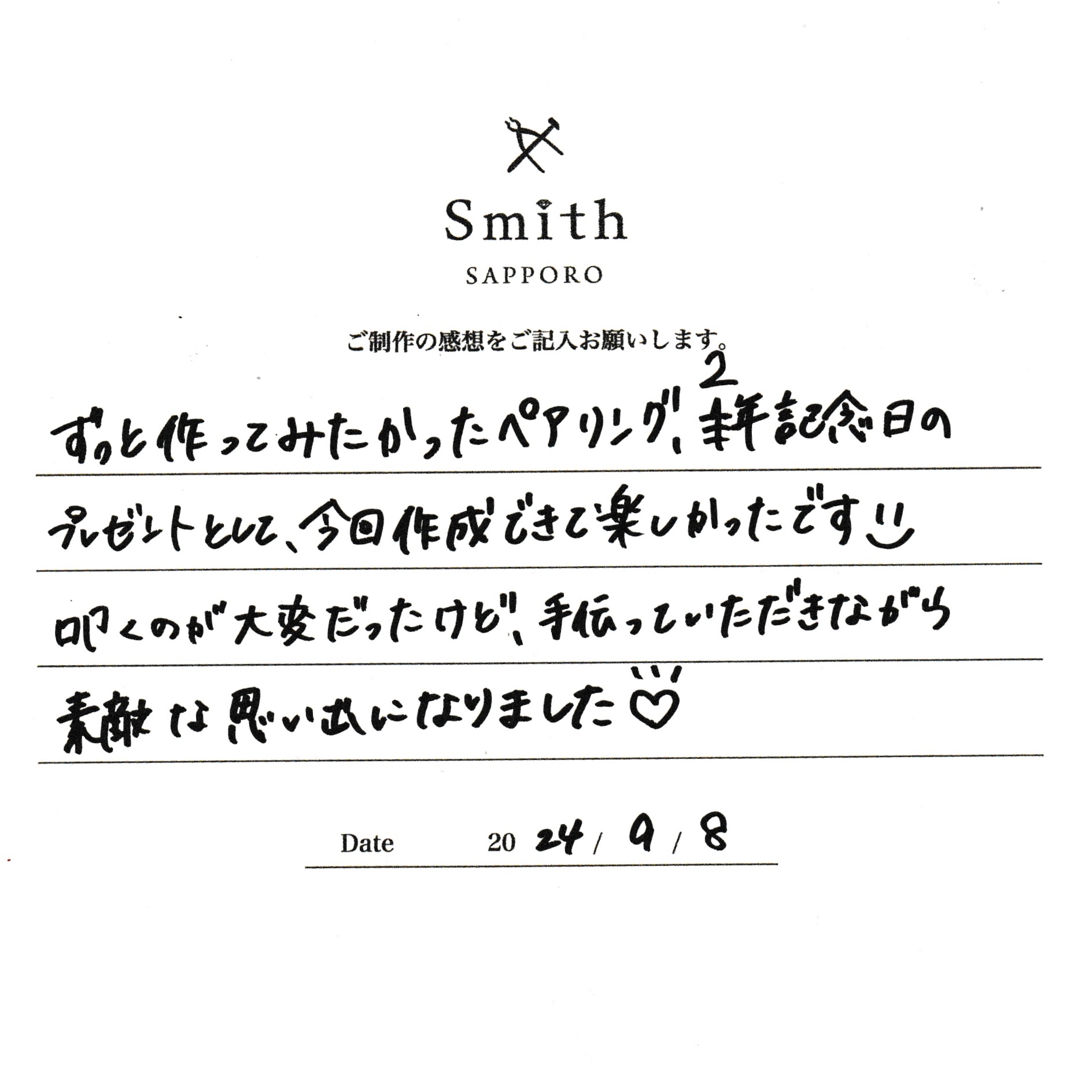 この度は、工房Smith京王プラザホテル札幌店で手作りペアリングのご制作誠にありがとうございました。