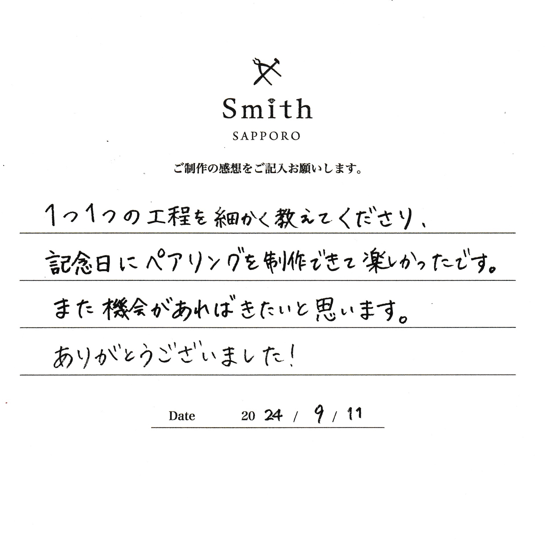 この度は、工房Smith京王プラザホテル札幌店で手作りペアリングのご制作誠にありがとうございました。
