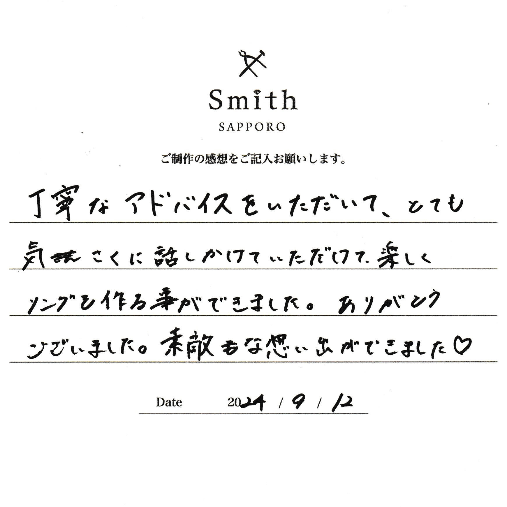 この度は、工房Smith京王プラザホテル札幌店で手作りペアリングのご制作誠にありがとうございました。