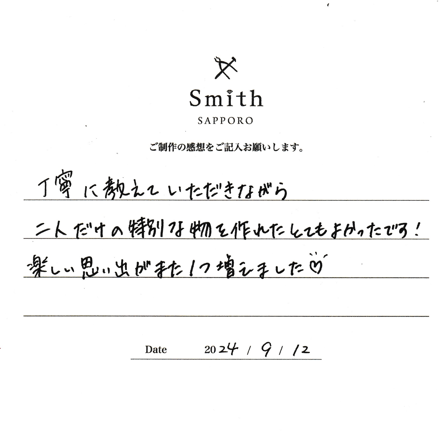 この度は、工房Smith京王プラザホテル札幌店で手作りペアリングのご制作誠にありがとうございました。