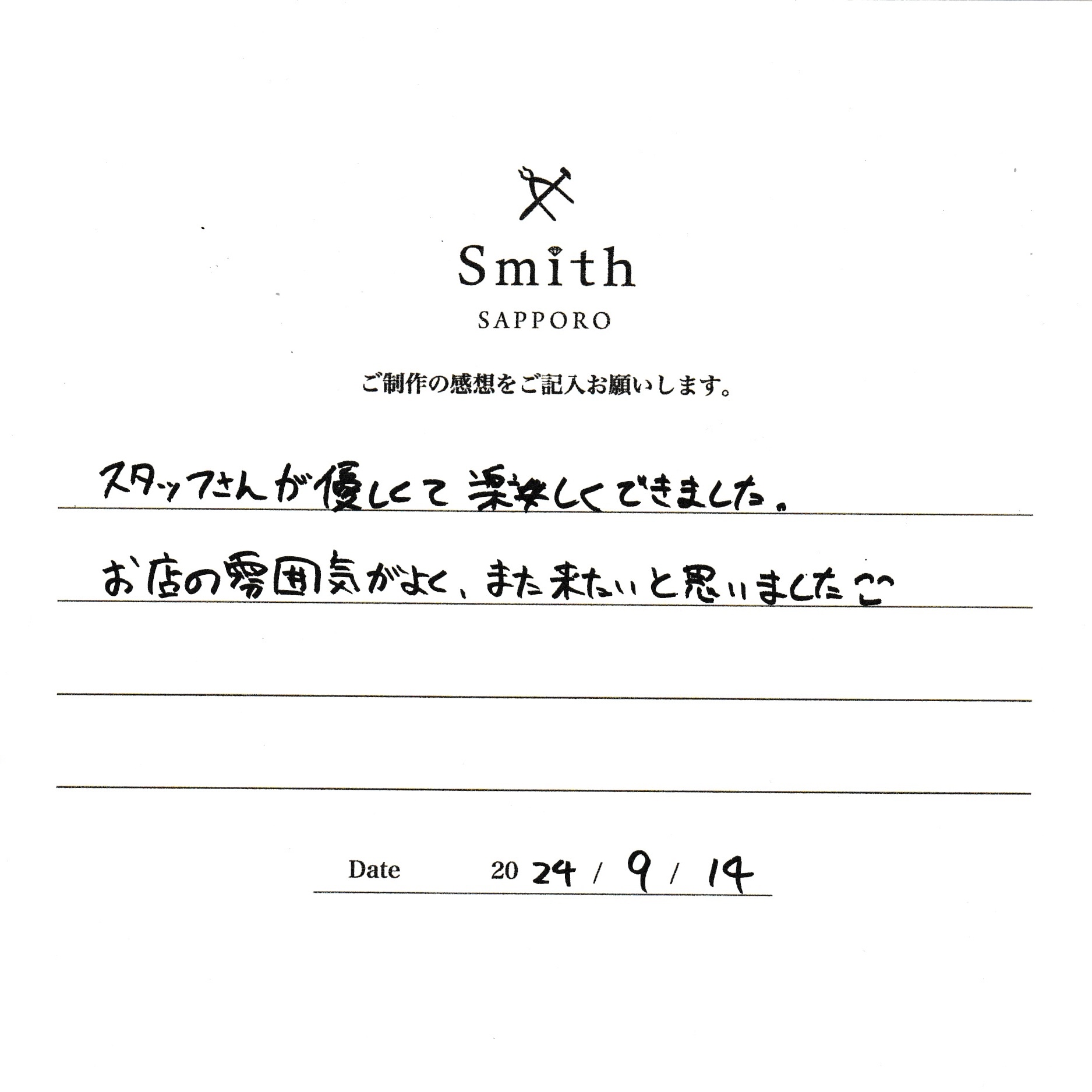 この度は、工房Smith京王プラザホテル札幌店で手作りペアリングのご制作誠にありがとうございました。