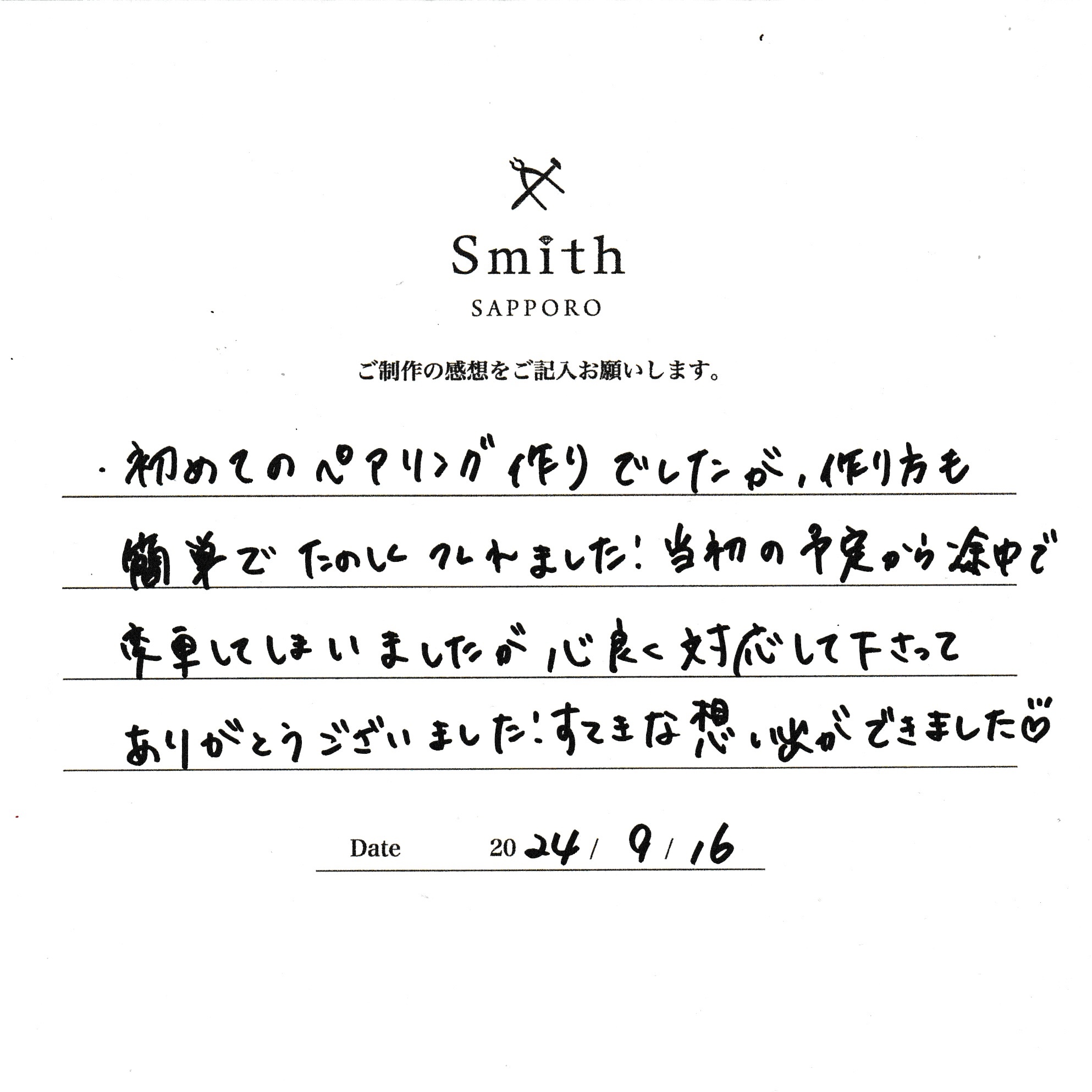 この度は、工房Smith京王プラザホテル札幌店で手作りペアリングのご制作誠にありがとうございました。