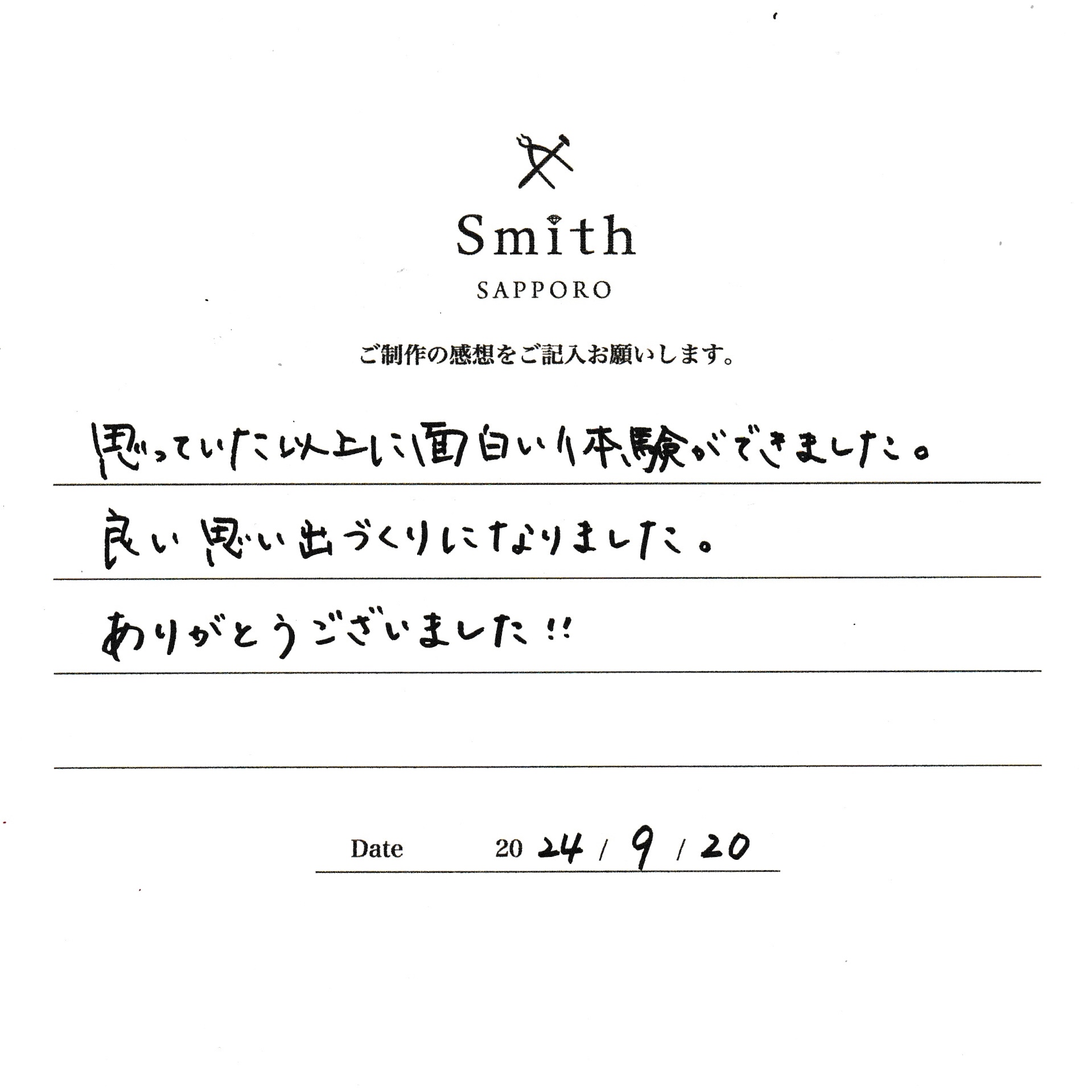 この度は、工房Smith京王プラザホテル札幌店で手作りペアリングのご制作誠にありがとうございました。