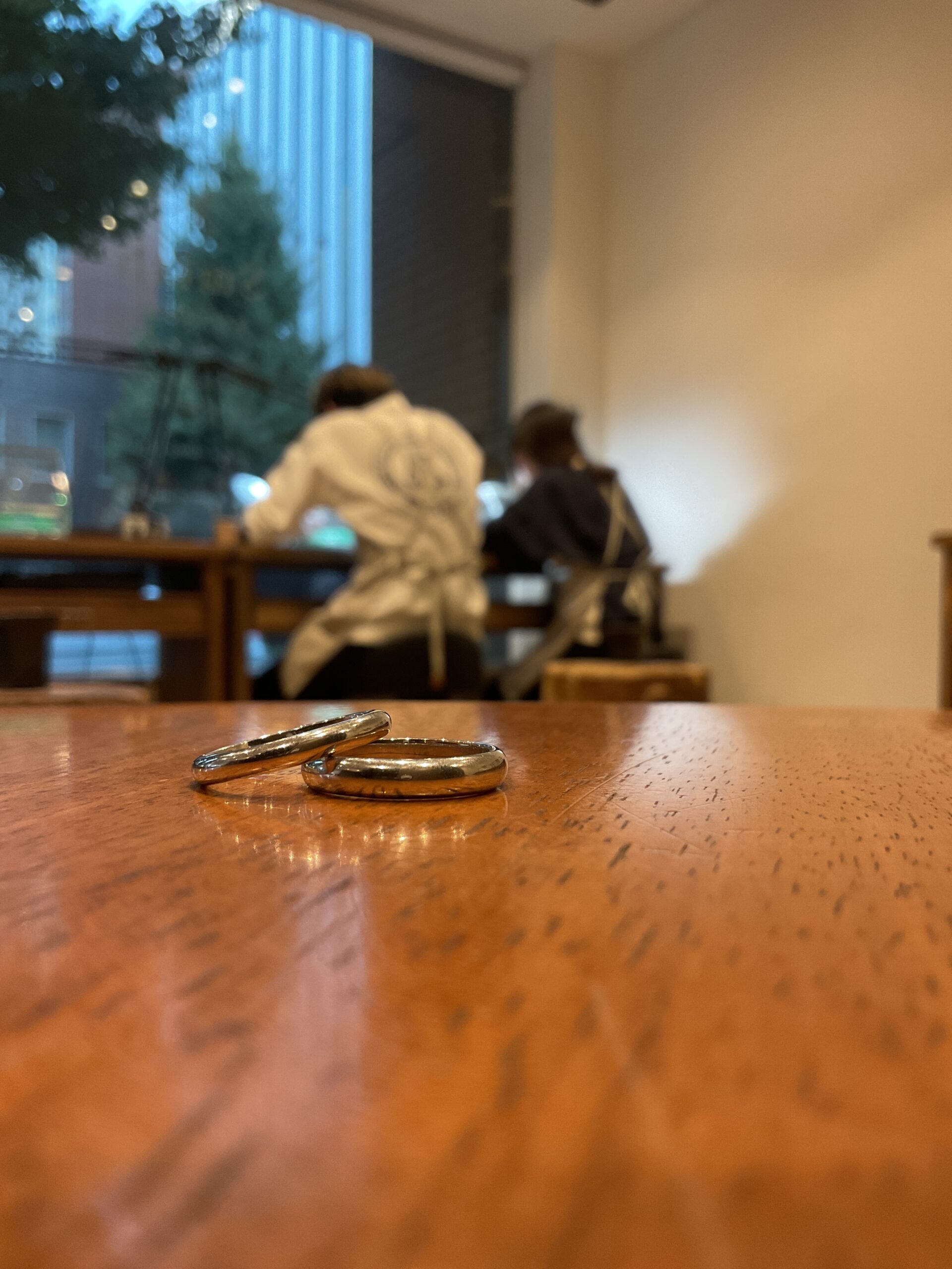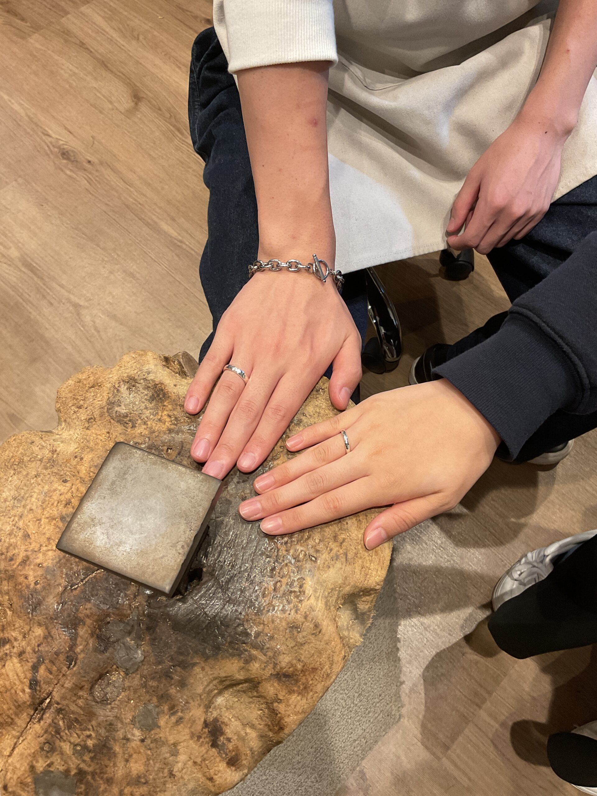 鏡面に仕上げたリングをハンマーで叩いて、おふたりだけの唯一無二の模様となったハンマー模様のリングが完成しましたね。