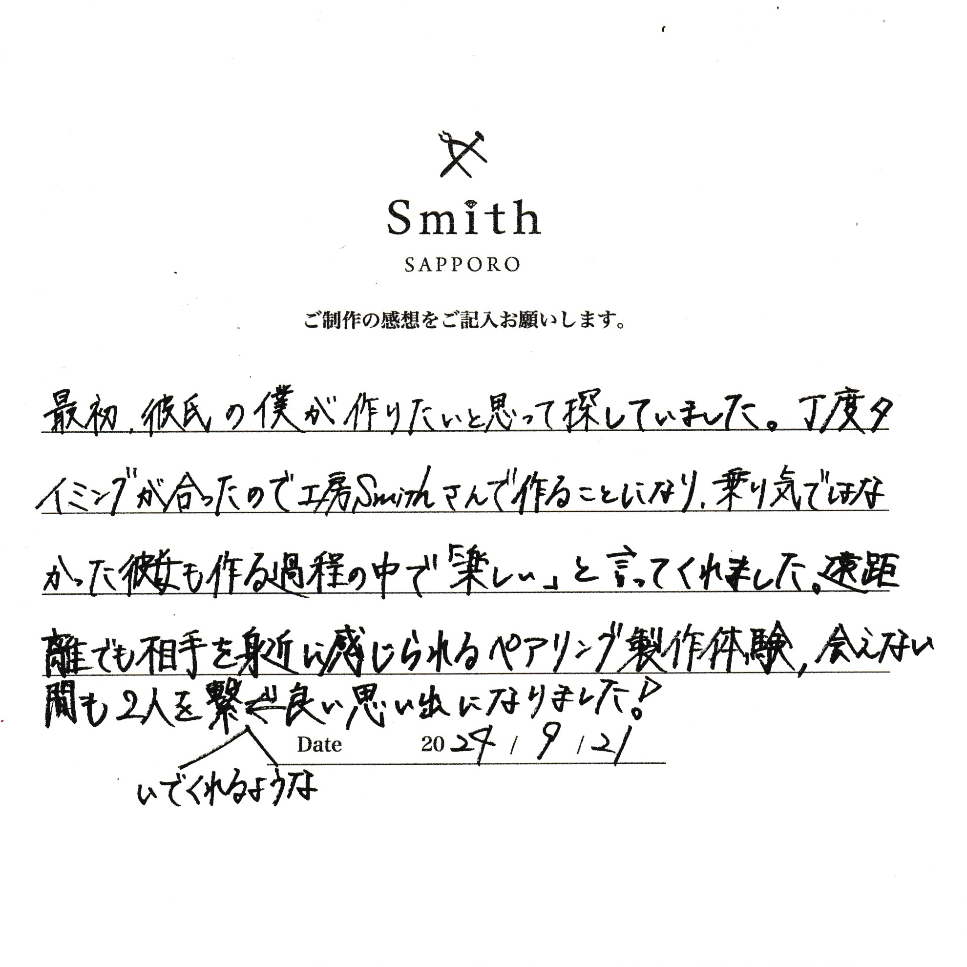 この度は、工房Smith京王プラザホテル札幌店で手作りペアリングのご制作誠にありがとうございました。