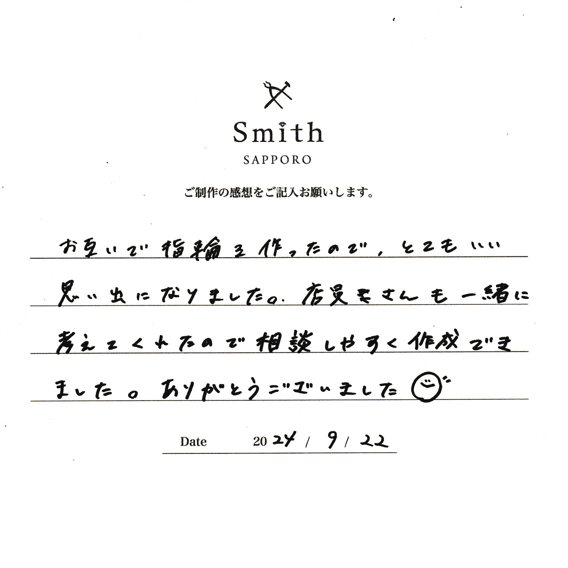 この度は、工房Smith京王プラザホテル札幌店で手作りペアリングのご制作誠にありがとうございました。