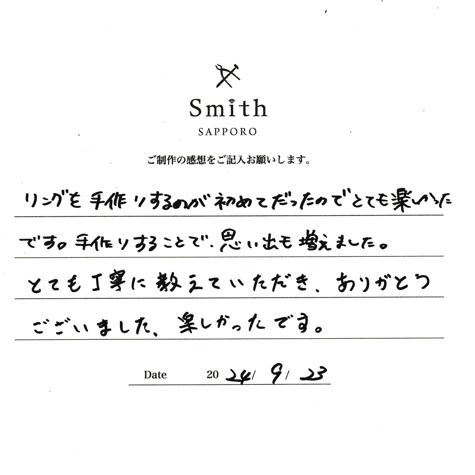 この度は、工房Smith京王プラザホテル札幌店で手作りペアリングのご制作誠にありがとうございました。