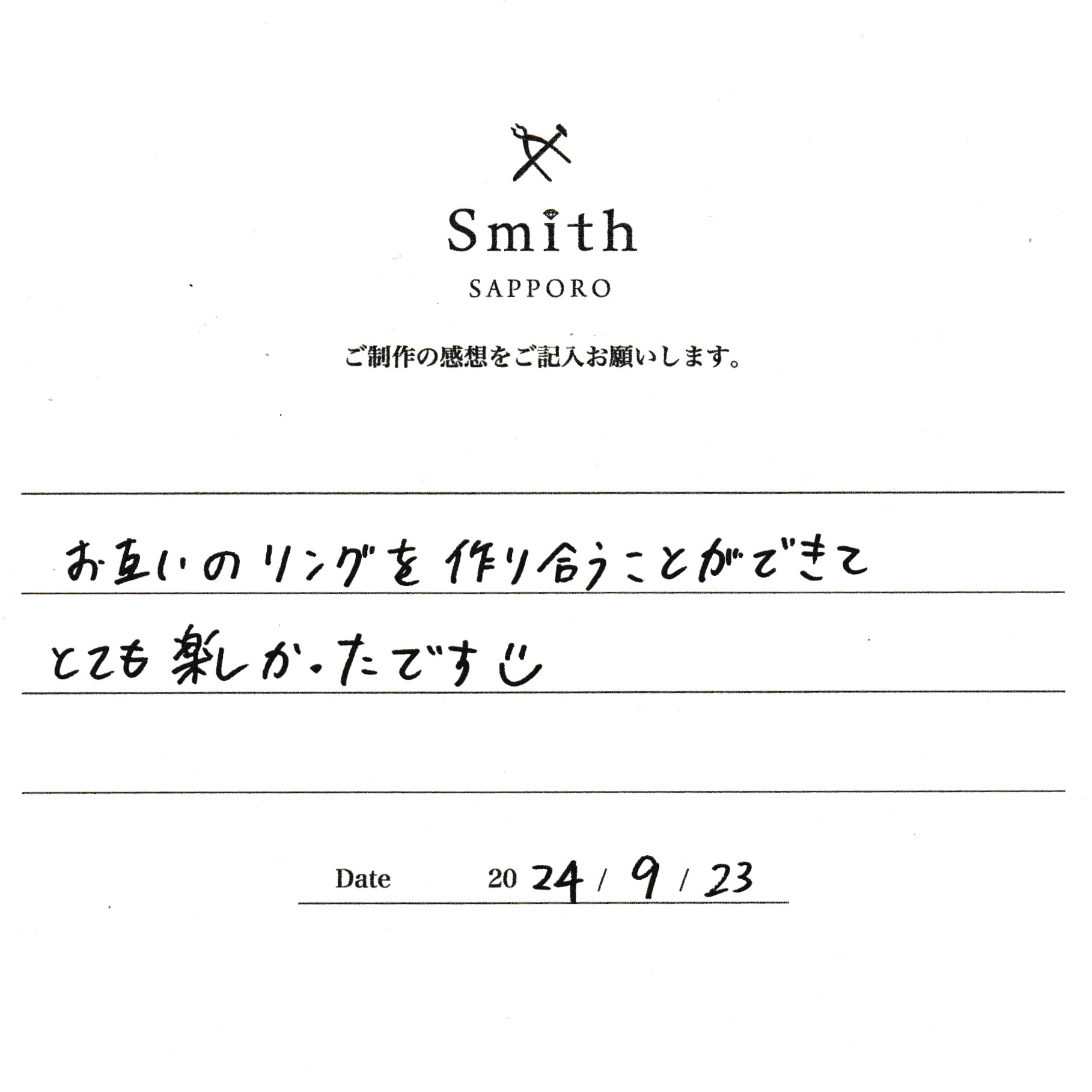 この度は、工房Smith京王プラザホテル札幌店で手作りペアリングのご制作誠にありがとうございました。