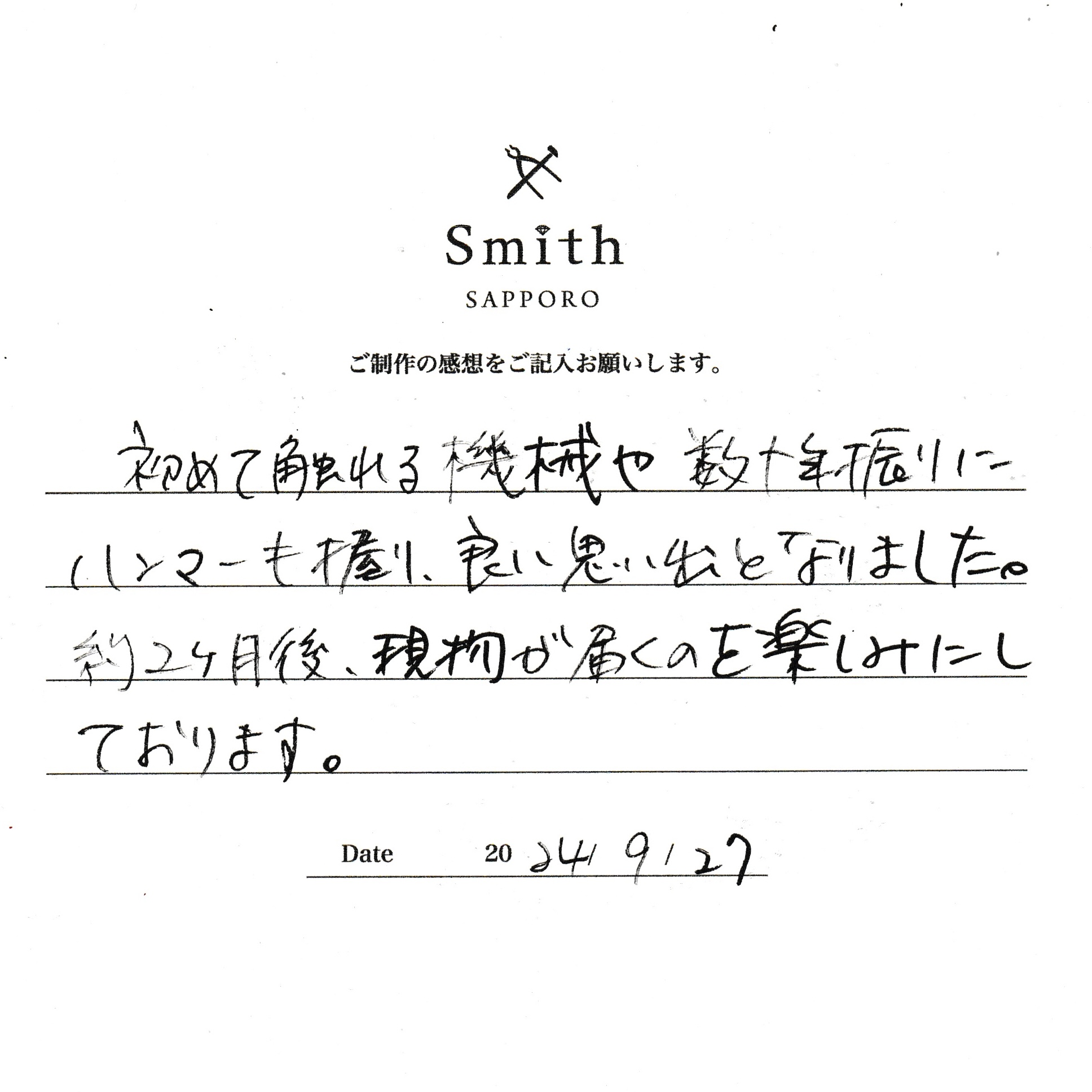 この度は、工房Smith京王プラザホテル札幌店で手作りペアリングのご制作誠にありがとうございました。