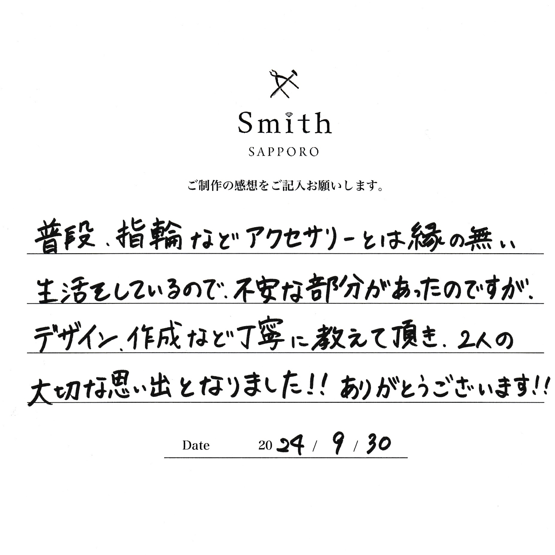 この度は、お二人の大切な婚約指輪のご制作に、工房スミス札幌店をお選び頂き、誠にありがとうございます。