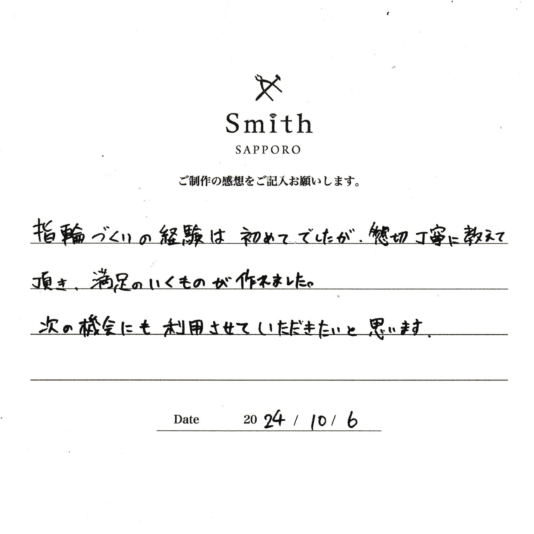 この度は、工房Smith京王プラザホテル札幌店で手作りペアリングのご制作誠にありがとうございました。