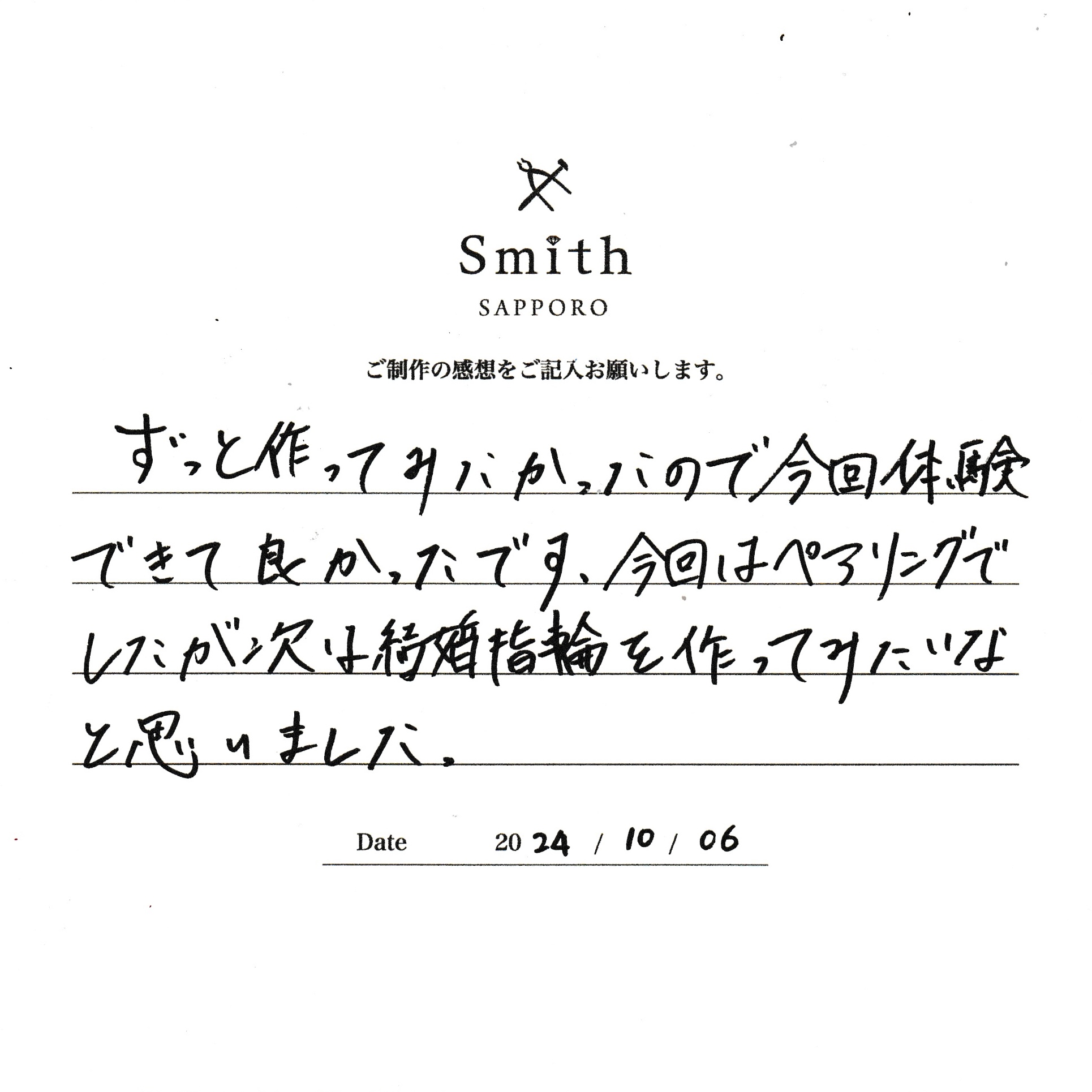 この度は、工房Smith京王プラザホテル札幌店で手作りペアリングのご制作誠にありがとうございました。