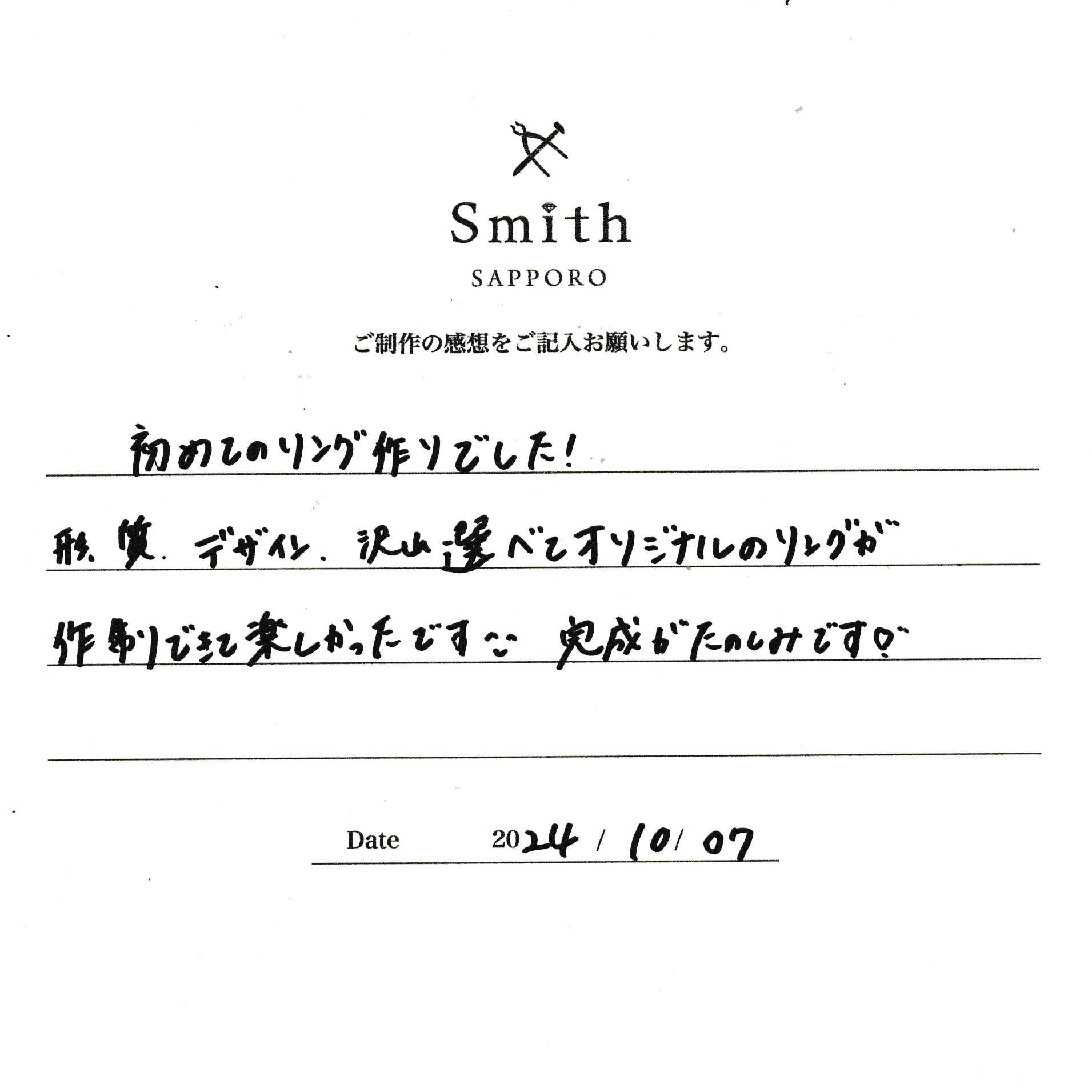 この度は、工房Smith京王プラザホテル札幌店で手作りペアリングのご制作誠にありがとうございました。