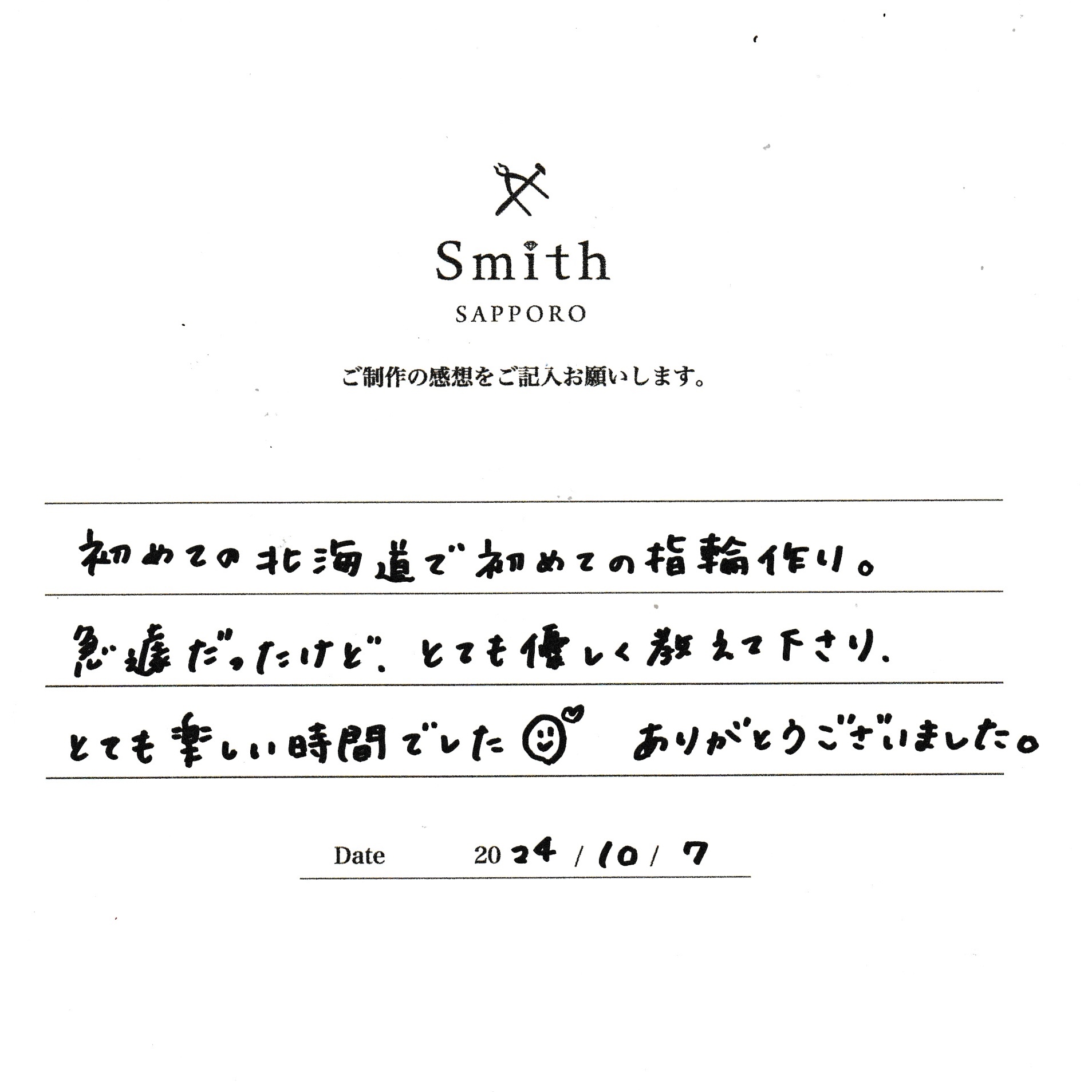 この度は、工房Smith京王プラザホテル札幌店で手作りペアリングのご制作誠にありがとうございました。