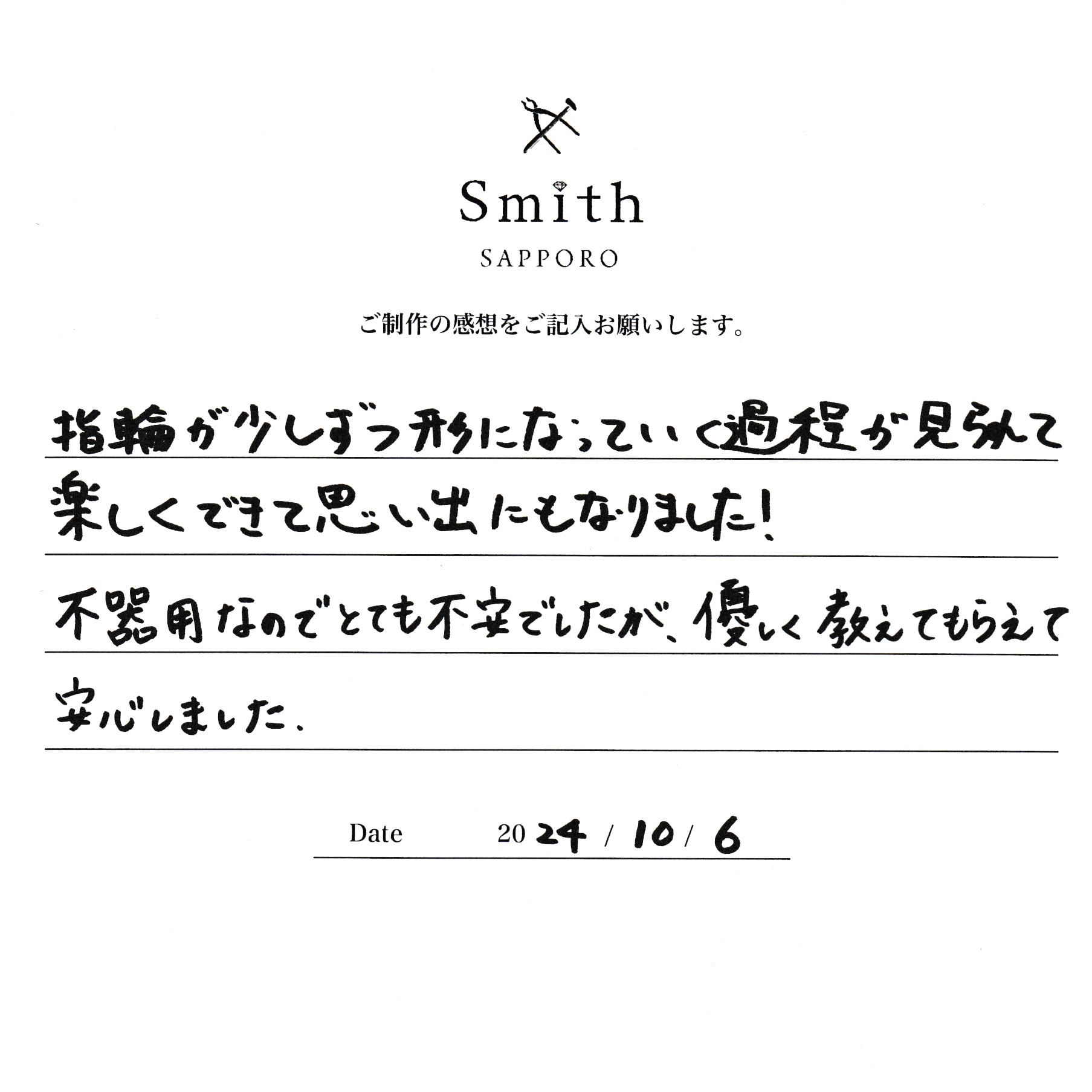 指輪が少しずつ形になっていく過程が見られて、楽しくできて思い出にもなりました!