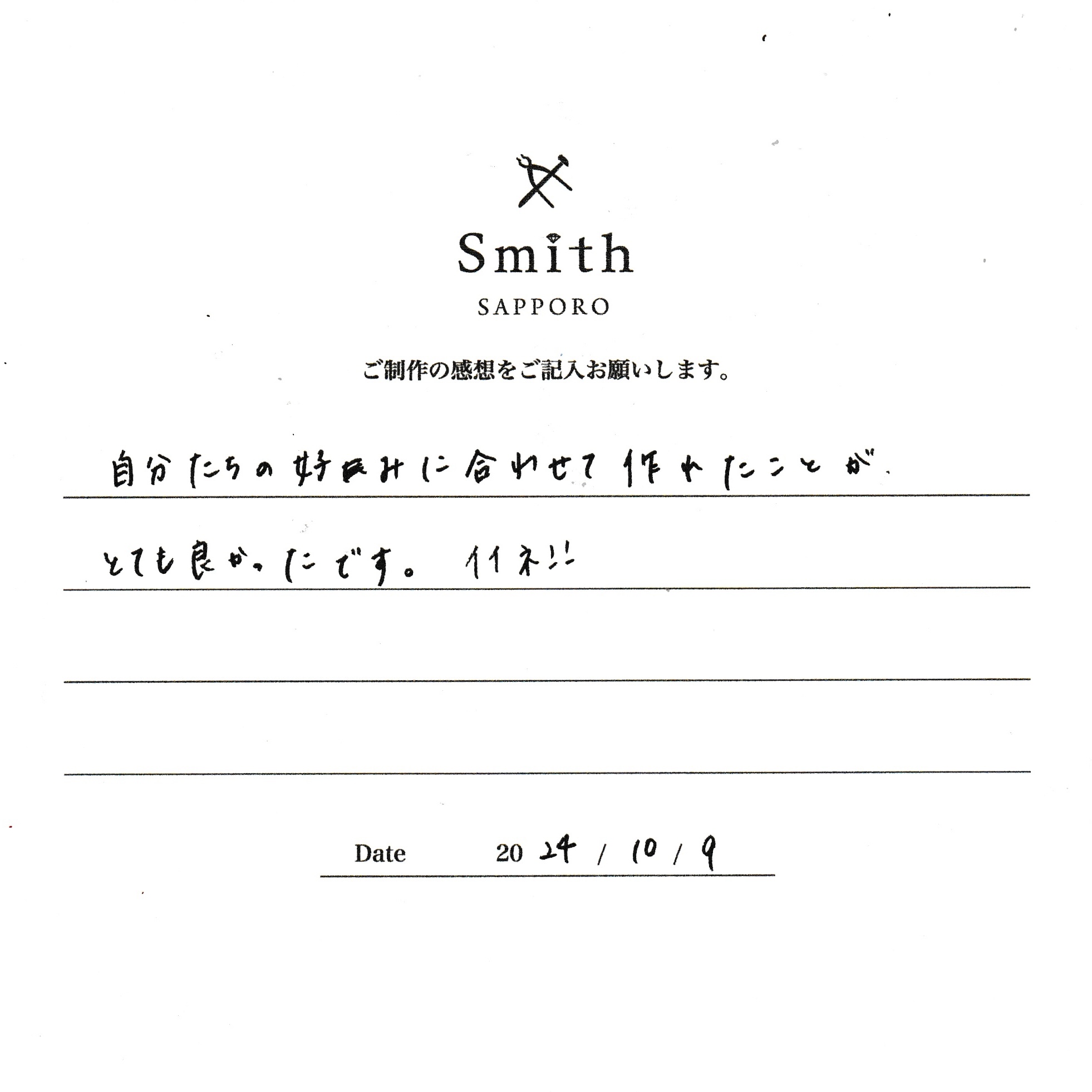 この度は、工房Smith京王プラザホテル札幌店で手作りペアリングのご制作誠にありがとうございました。
