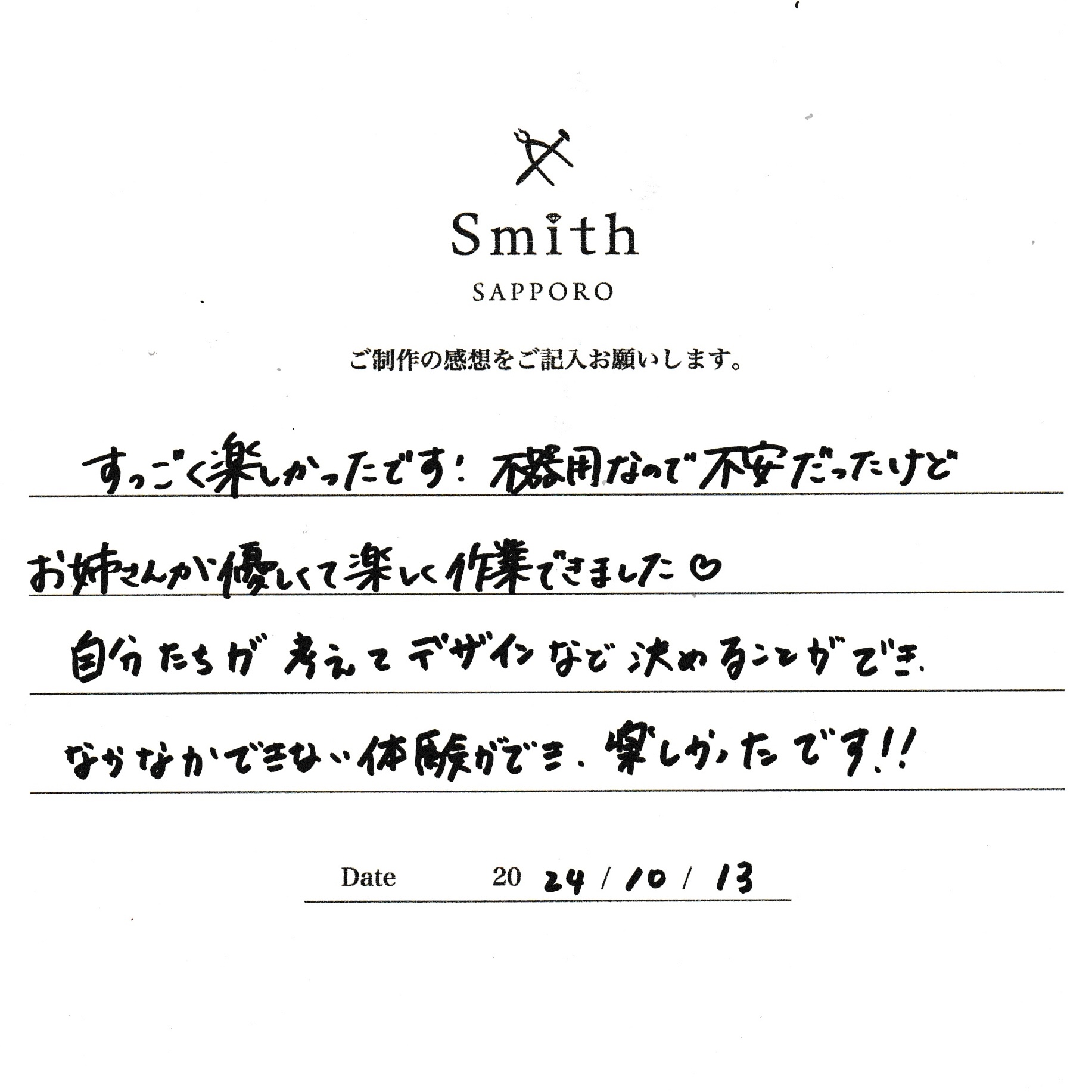 この度は、工房Smith京王プラザホテル札幌店で手作りペアリングのご制作誠にありがとうございました。