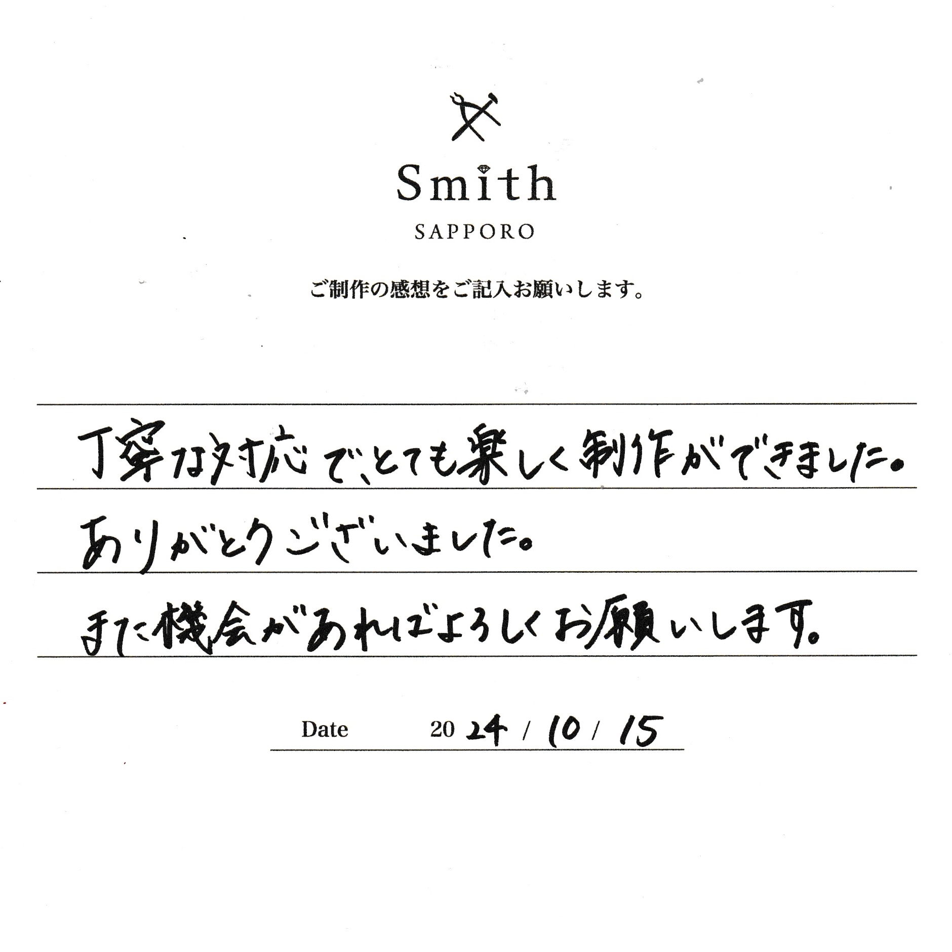 この度は、工房Smith京王プラザホテル札幌店で手作りペアリングのご制作誠にありがとうございました。