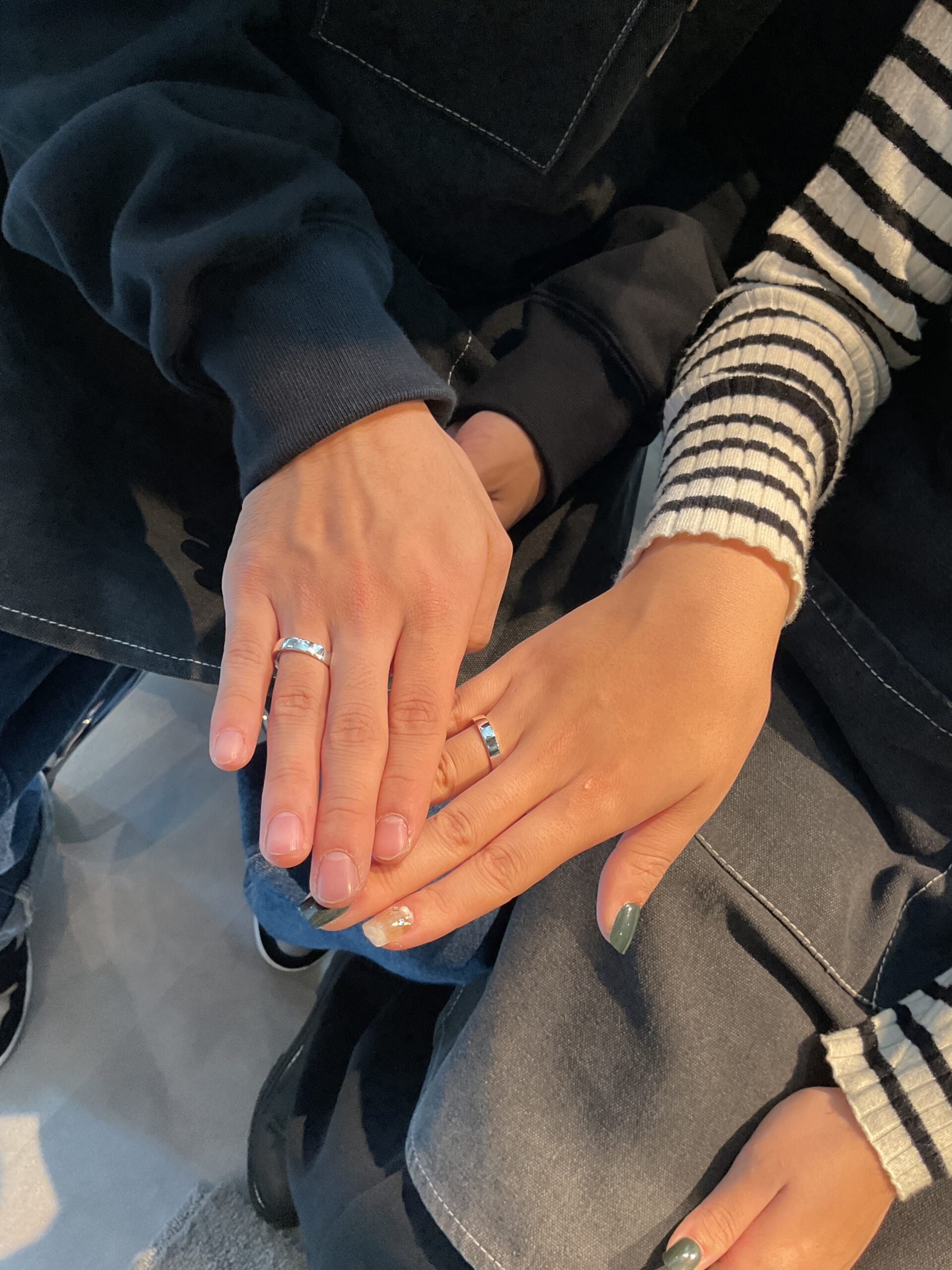 鏡面仕上げのリングに、おふたりの記念日とイニシャルの刻印をお入れする、王道シンプルなデザインのペアリングになりましたね。