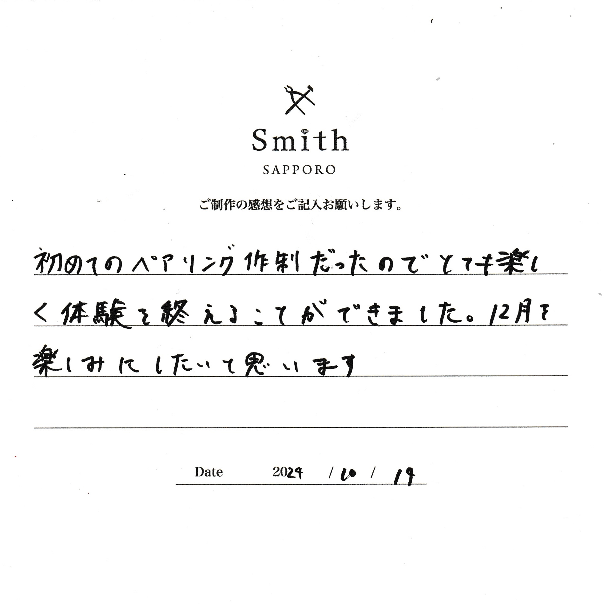 この度は、工房Smith京王プラザホテル札幌店で手作りペアリングのご制作誠にありがとうございました。