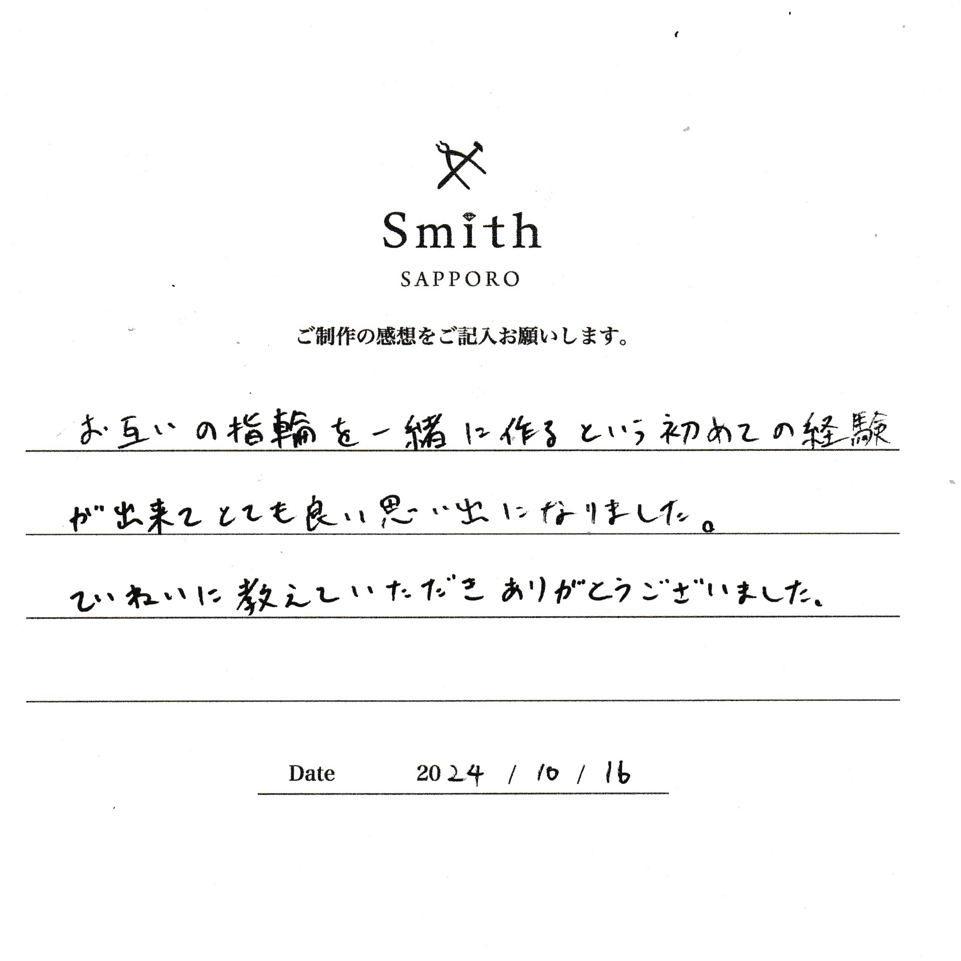 この度は、工房Smith京王プラザホテル札幌店で手作りペアリングのご制作誠にありがとうございました。