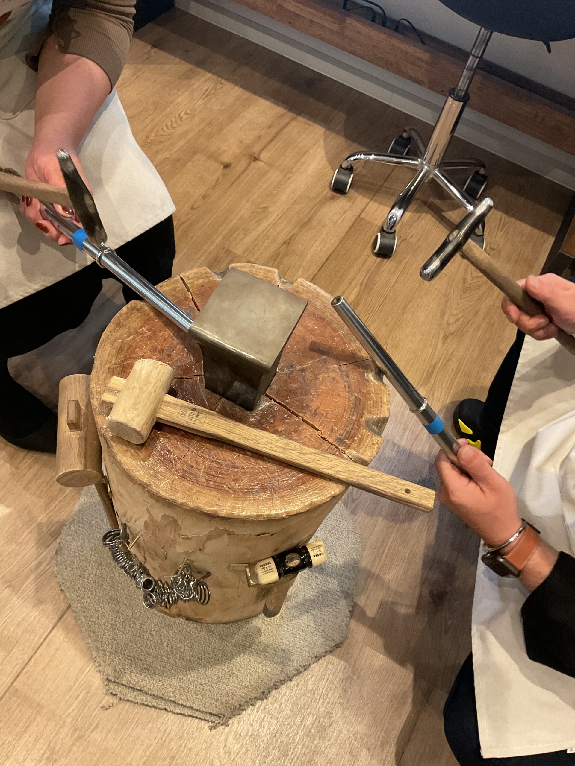基本の形は、3mm幅と4mm幅のリングをお選びいただき、表面にはオリジナル感のあるハンマー模様を付けていただきました。