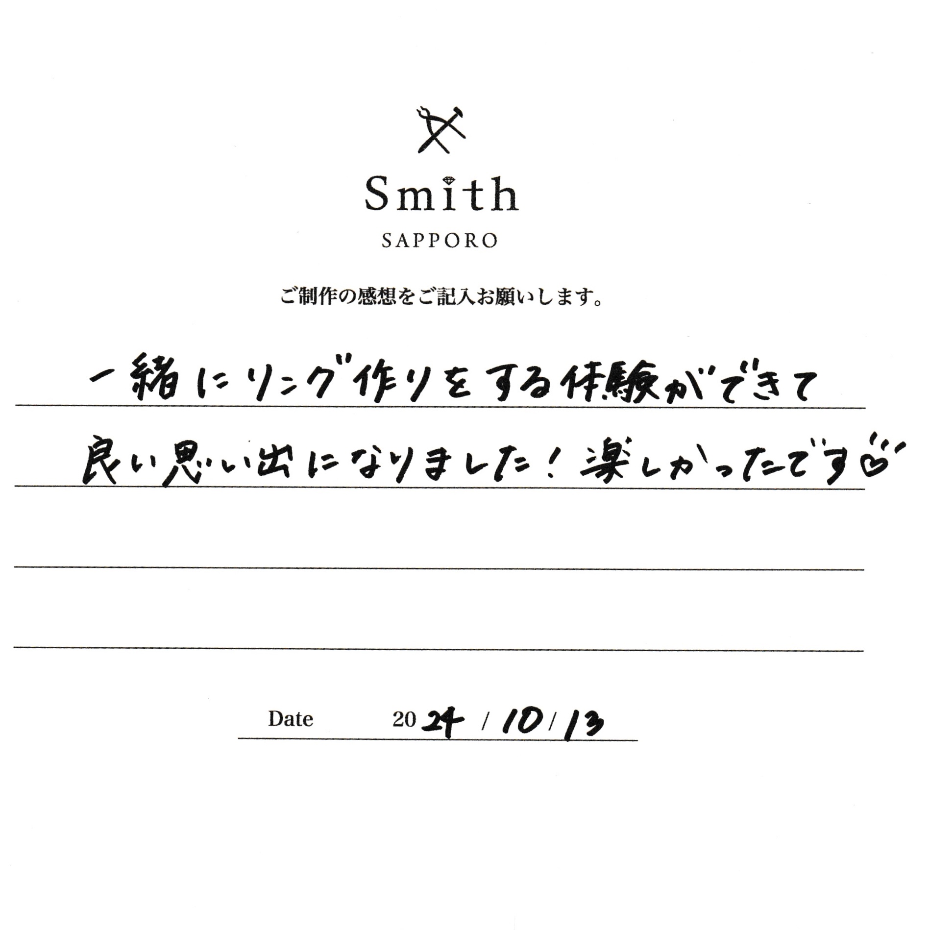この度は、工房Smith京王プラザホテル札幌店で手作りペアリングのご制作誠にありがとうございました。