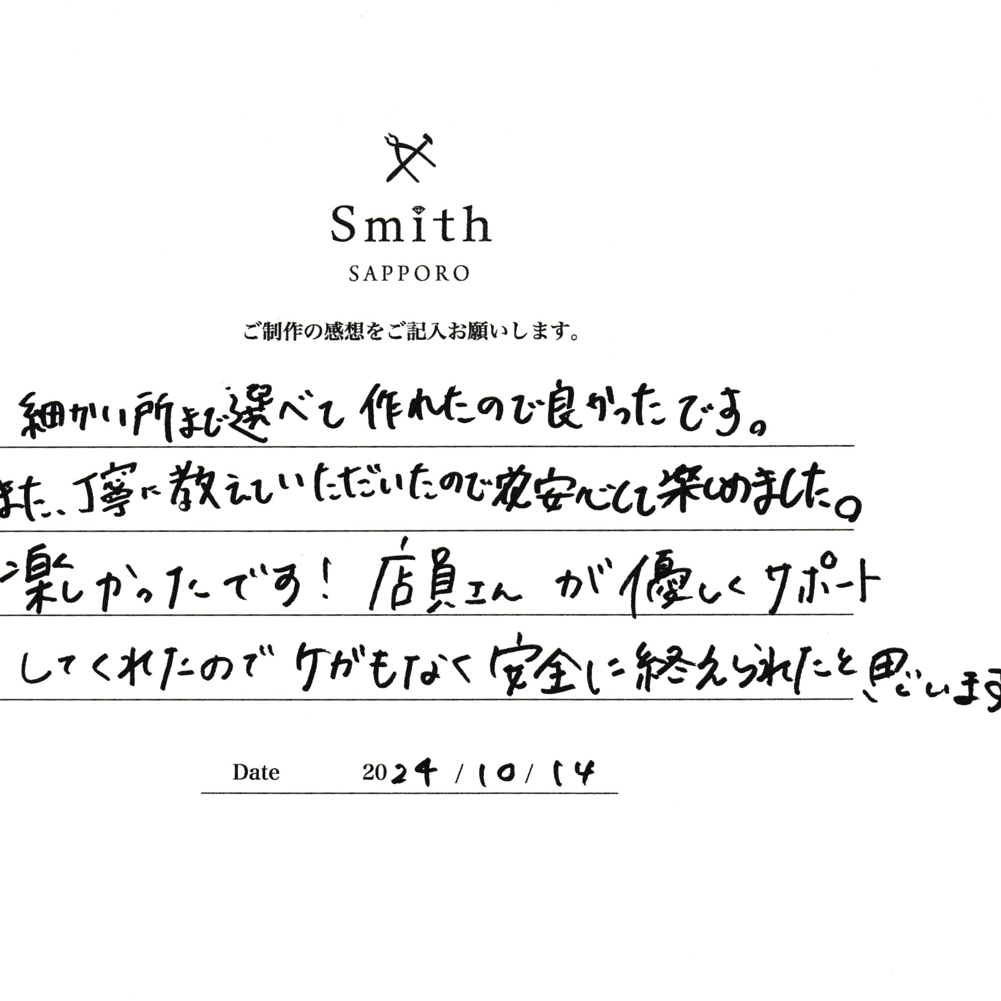この度は、工房Smith京王プラザホテル札幌店で手作りペアリングのご制作誠にありがとうございました。