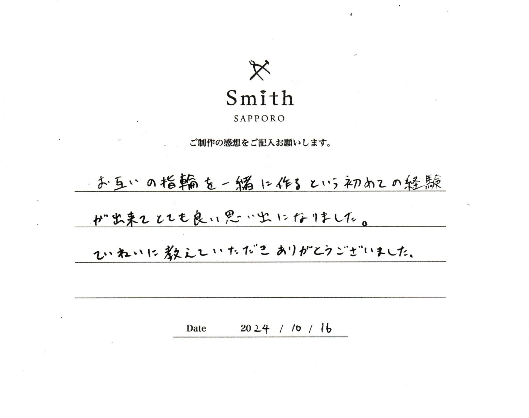 この度は、工房Smith京王プラザホテル札幌店で手作りペアリングのご制作誠にありがとうございました。