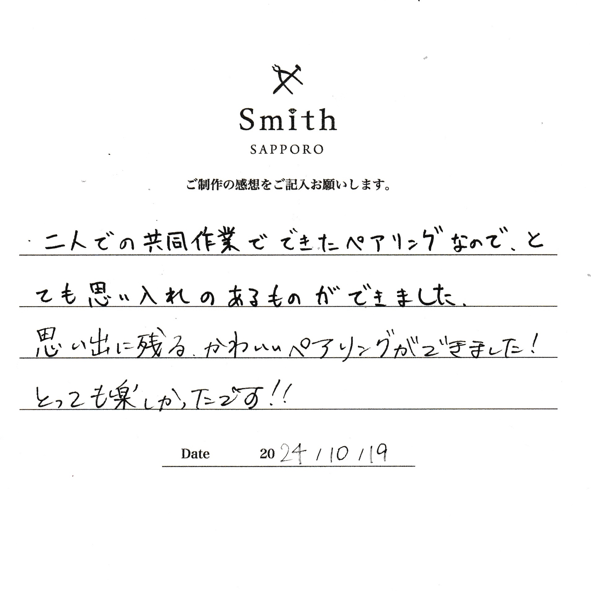 この度は、工房Smith京王プラザホテル札幌店で手作りペアリングのご制作誠にありがとうございました。