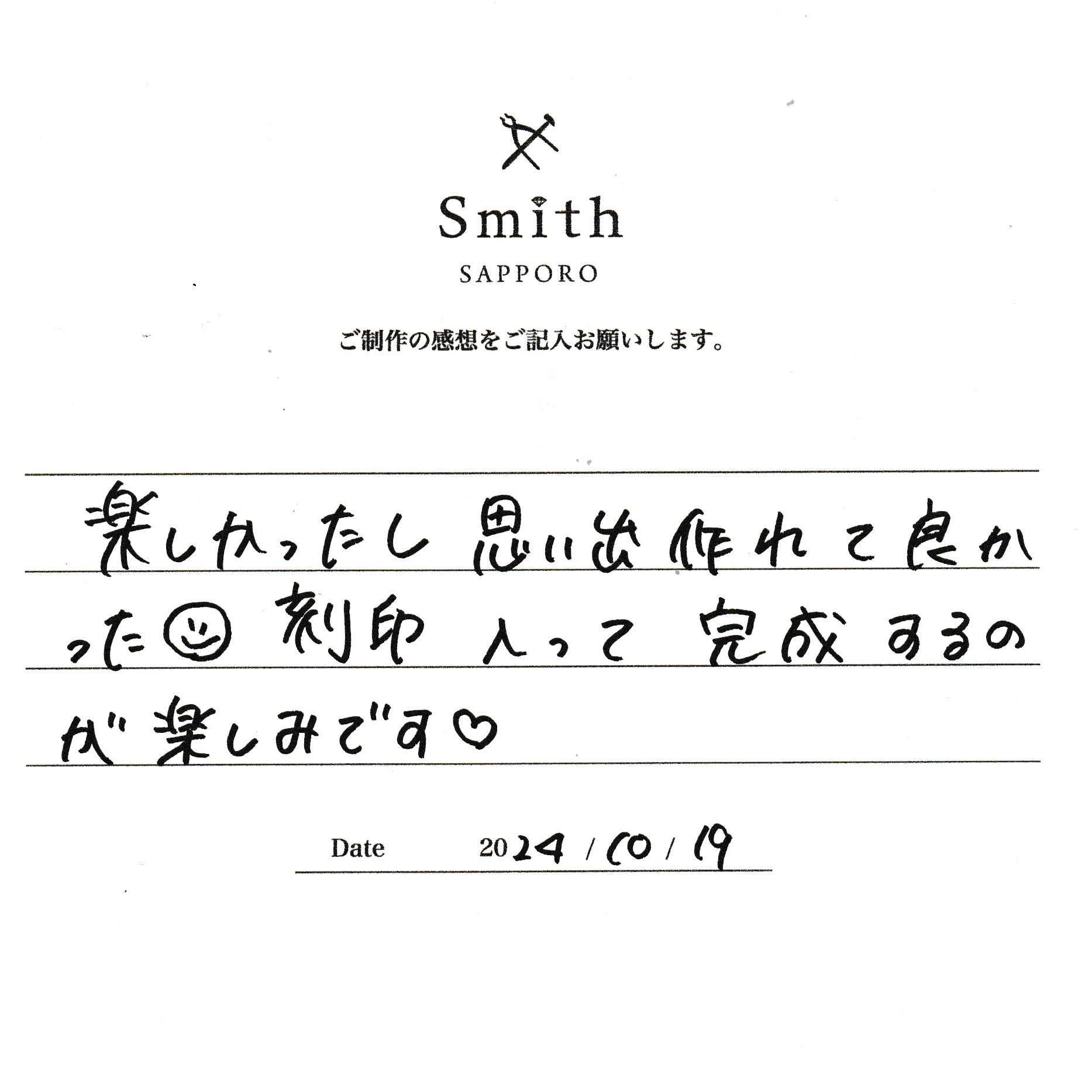 この度は、工房Smith京王プラザホテル札幌店で手作りペアリングのご制作誠にありがとうございました。